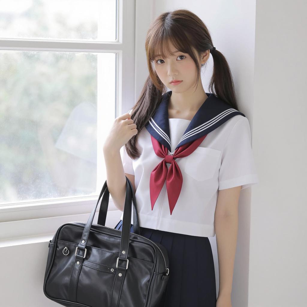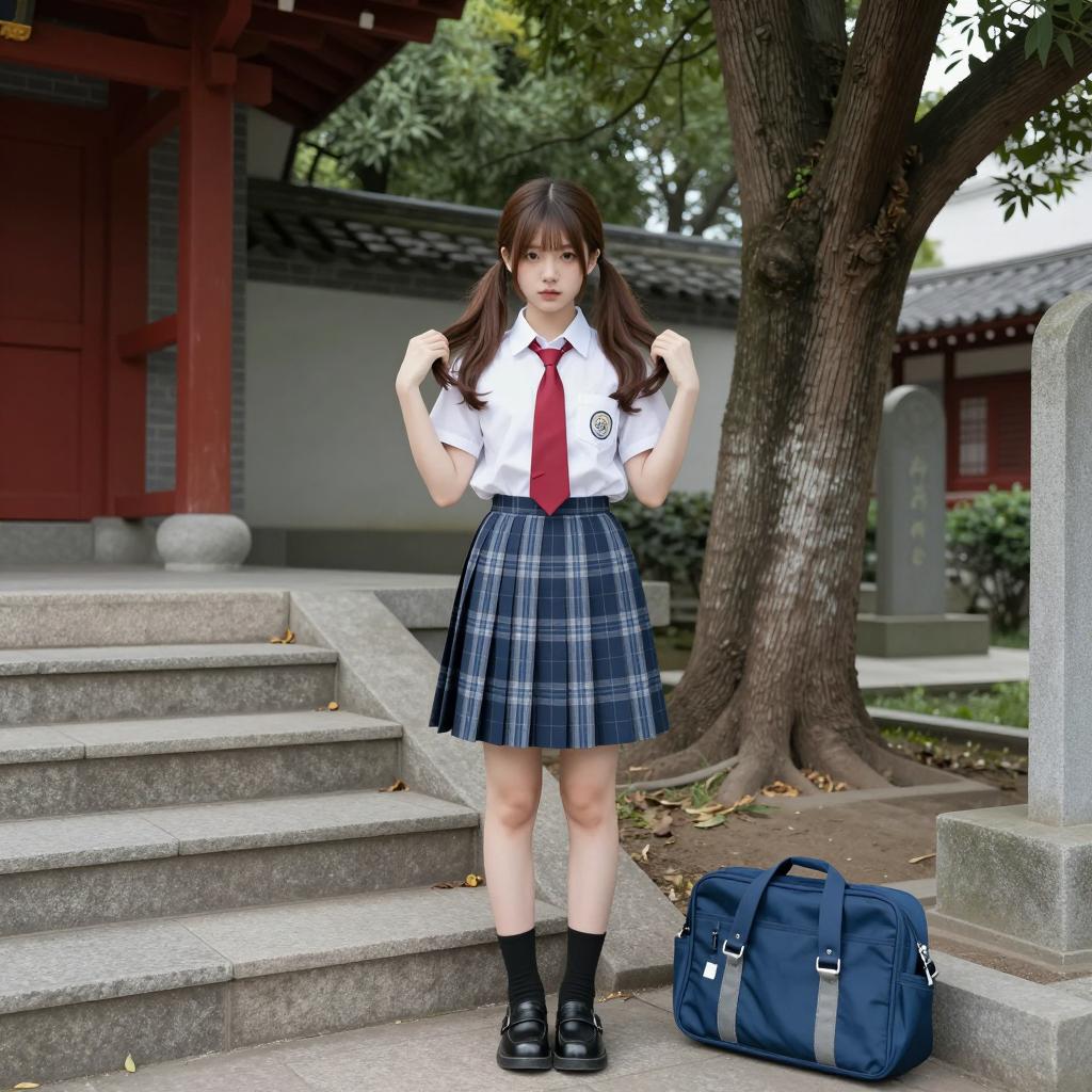 Asian girl with long brown hair in pigtails, wearing white blouse, blue plaid skirt, black knee-high socks, and black shoes. She sits on a wooden bench outdoors, holding her blouse, with a blue backpack on the left and shoes on the ground. Greenery and wooden structures in the background. Photo style.