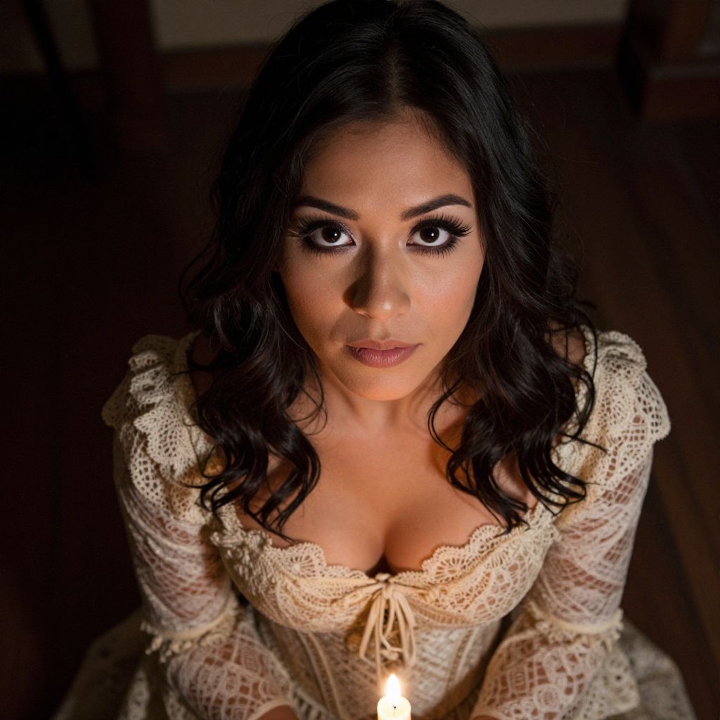 Envision a captivating portrait of an enigmatic Amazonian woman cloaked in Victorian elegance, illuminated by soft candlelight casting subtle shadows on her surroundings. From above, this overhead perspective showcases the intricate lace adorning her bodice and the delicate patterns on her corset. Her dark wavy hair gracefully falls over one eye, while her piercing gaze, accentuated by long lashes and a hint of smoky eyeshadow, exudes curiosity and an air of mystery. This portrait seamlessly blends historical grace with intrigue as she seems to hold a hidden secret, hinted at by the subtle smile on her face that promises untold stories.