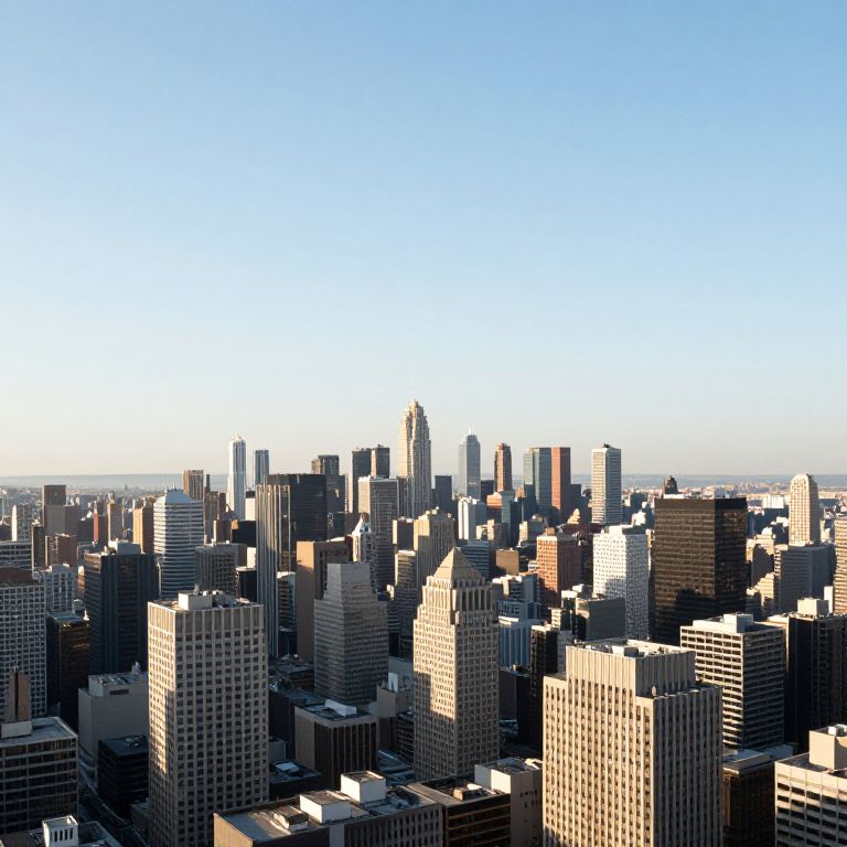 Photograph of a bustling cityscape at sunrise, showcasing a dense array of high-rise buildings with varying heights and architectural styles, under a clear, bright