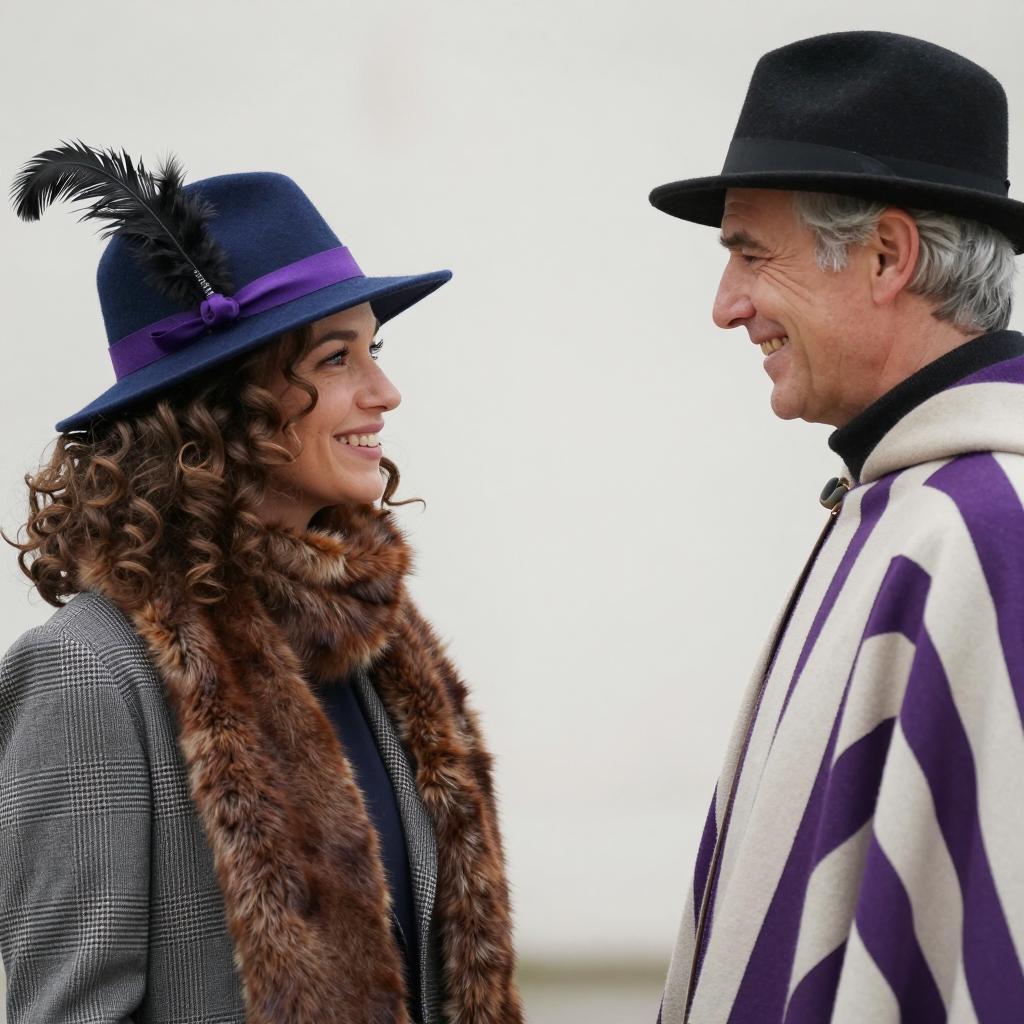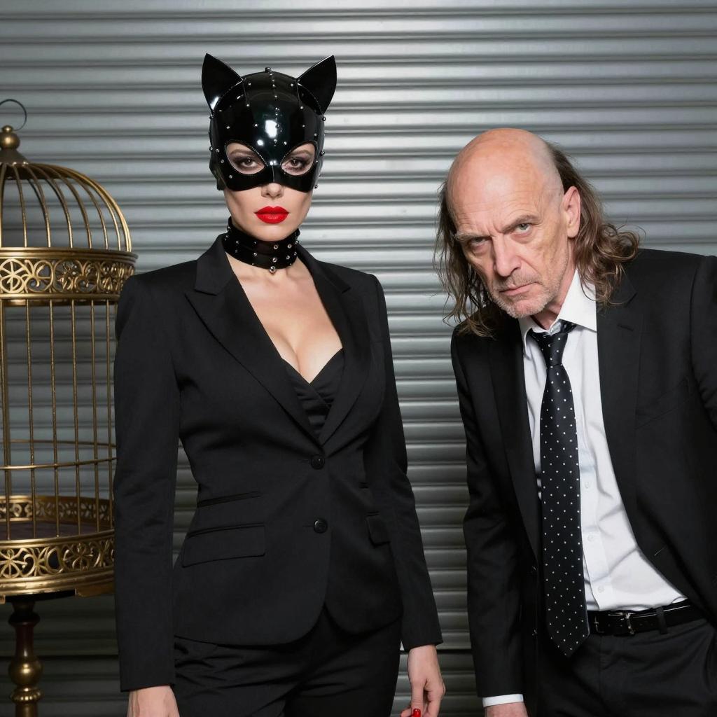 A bald man in a leopard print jacket and pink shirt holds a knife to the head of a person with a large, curly, gray wig. The man's face shows a wide, intense grin. Dark background with faint green foliage. Two people, man on the left, person with wig on the right.