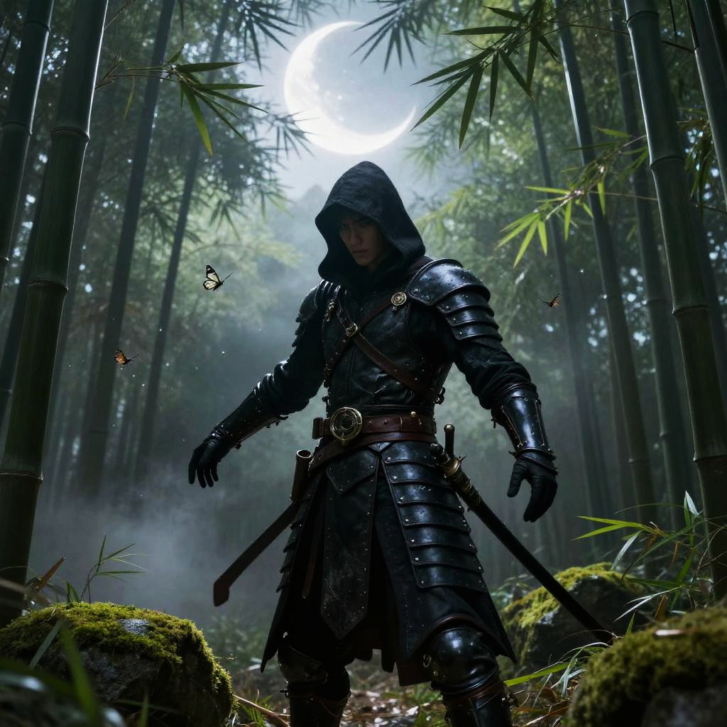 Stealthy shadow assassin clad in dark leather armor, in a misty bamboo forest under a crescent moon, digital noir style with high contrast and film grain, magical sparkles drifting in the air, fantasy art, vivid colors, dappled light, misty atmosphere, soft rim light, ultradetailed foliage, mossy stones, fluttering moths, dramatic backlight, subtle film grain, cinematic composition, serene expression, graceful posture, fine texture, storybook charm, dreamy ambience, high detail, crisp focus.