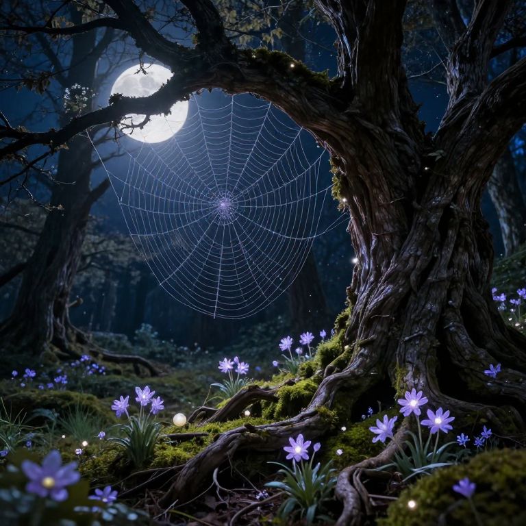 Moonlit forest with a glowing spiderweb on a twisted, moss-covered tree, surrounded by purple flowers and soft, twinkling lights.