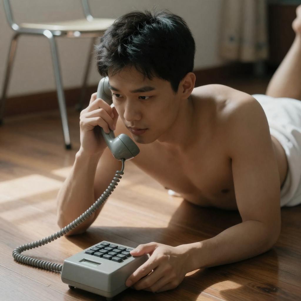 Shirtless man with short black hair lies on wooden floor, holding vintage gray phone to his ear. White towel covers lower body. Background includes metal chair and patterned curtains. Sunlight casts shadows on floor. Intense focus on phone.