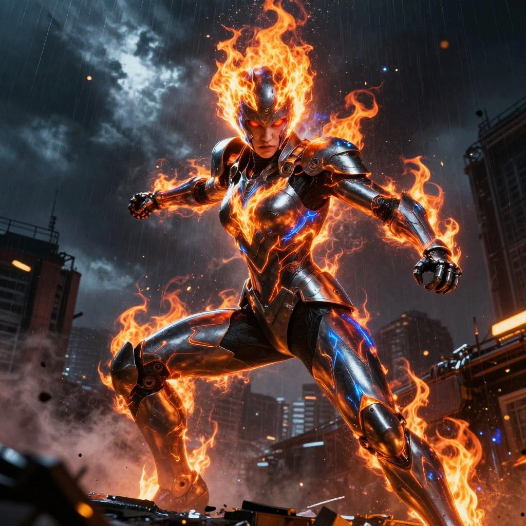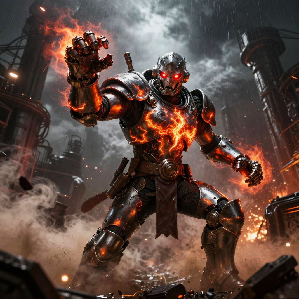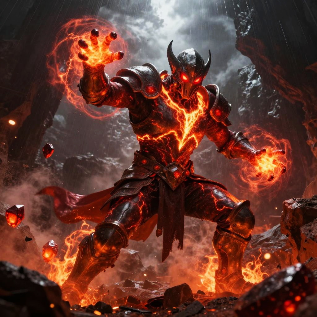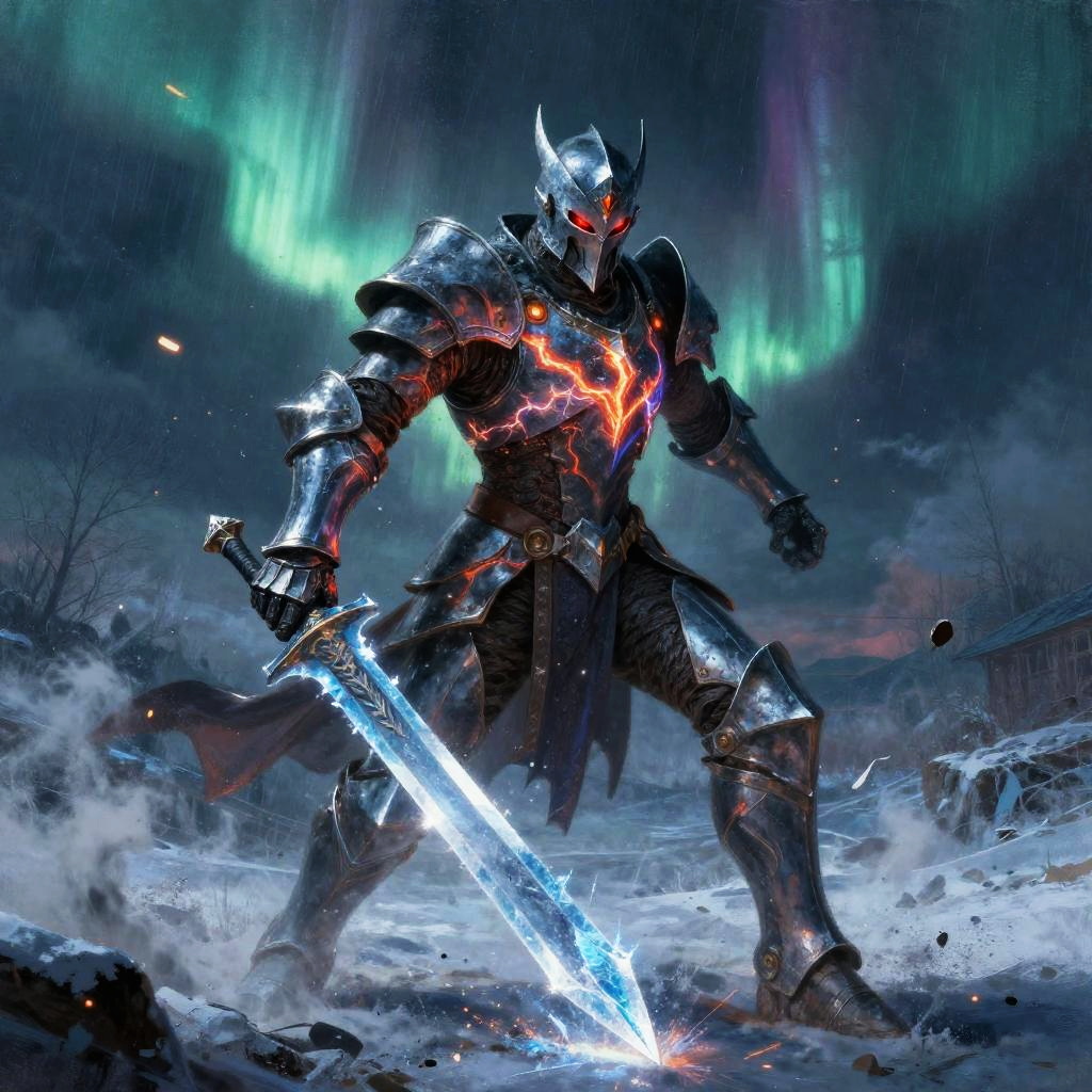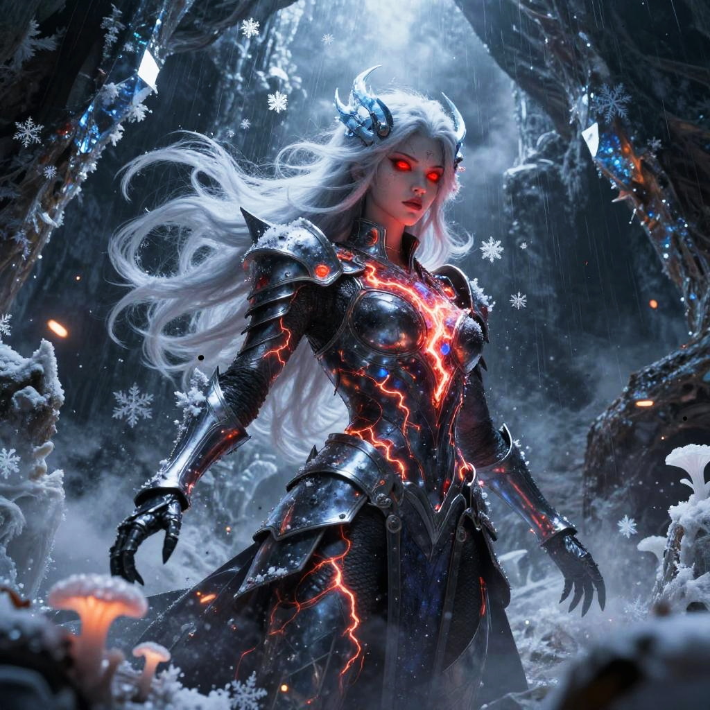 Giant ice elemental towering with crystalline shards piercing the air in raging blizzard atop a frozen mountain peak, red eyes blazing, dark metallic armor contrasting vivid swirling fire; lightning veins a stormy sky, sparks and embers fly, rain or dust whipping, debris and smoke swirl. Dynamic low-angle pose, high contrast, dramatic rim lighting, volumetric haze, saturated color, ultra-detailed textures, cinematic scale; comic-book realism finish; mood: fierce, cold, stark whites and icy blues, harsh lighting.
