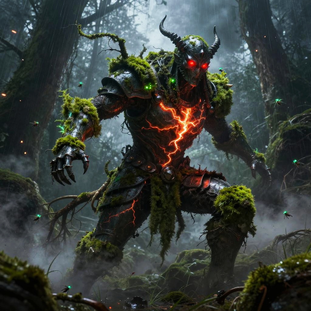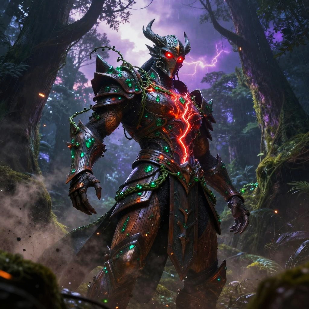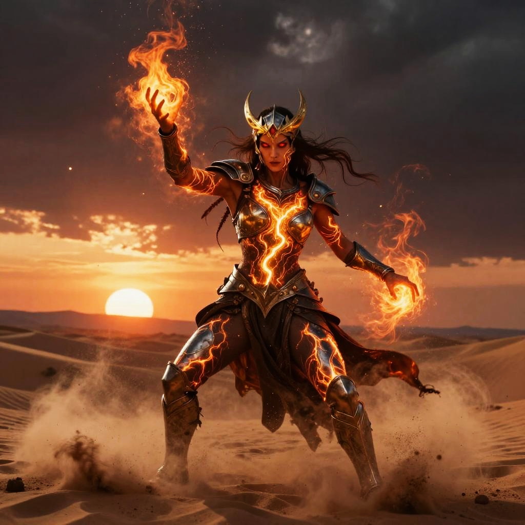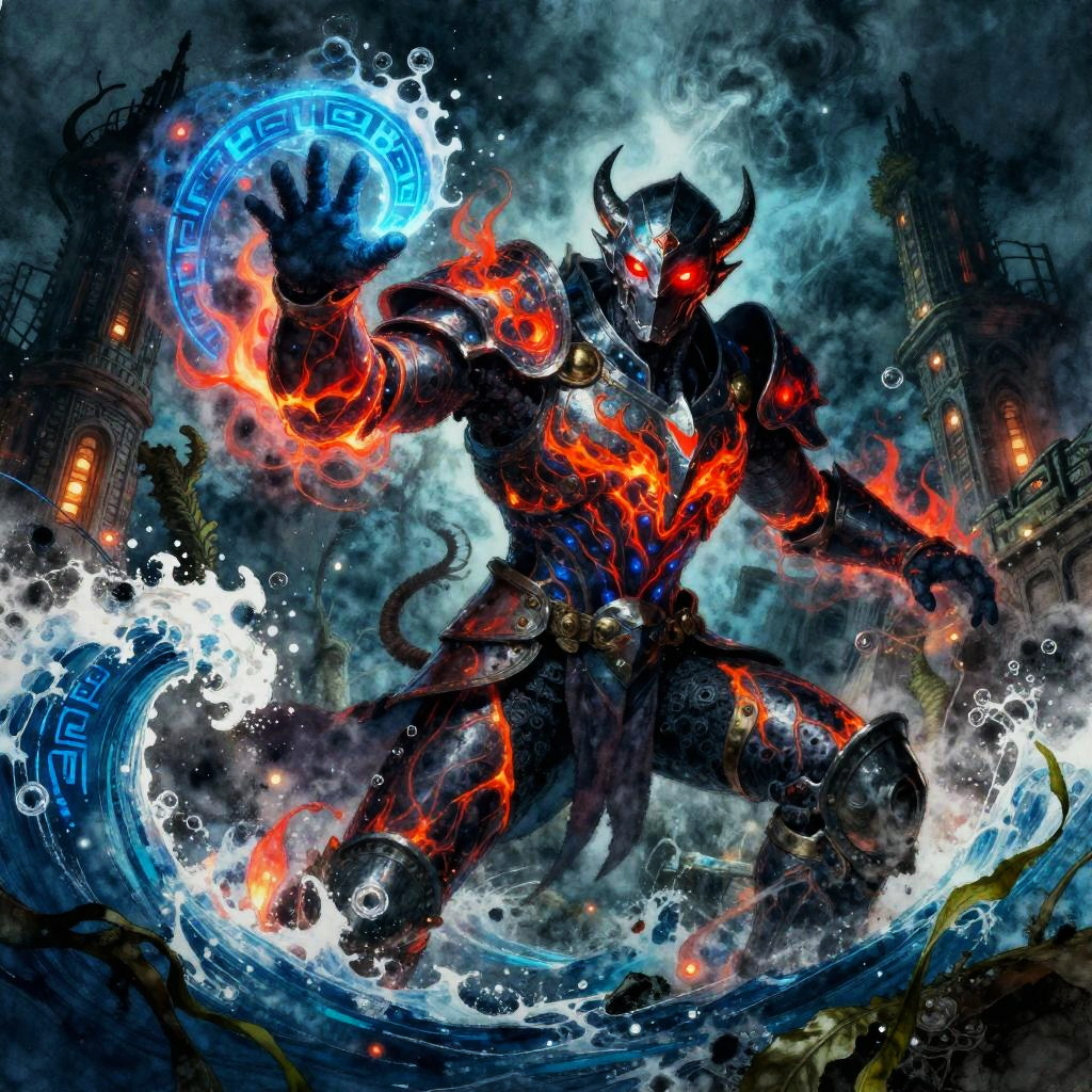 Giant ice elemental towering with crystalline shards piercing the air in raging blizzard atop a frozen mountain peak, red eyes blazing, dark metallic armor contrasting vivid swirling fire; lightning veins a stormy sky, sparks and embers fly, rain or dust whipping, debris and smoke swirl. Dynamic low-angle pose, high contrast, dramatic rim lighting, volumetric haze, saturated color, ultra-detailed textures, cinematic scale; comic-book realism finish; mood: fierce, cold, stark whites and icy blues, harsh lighting.