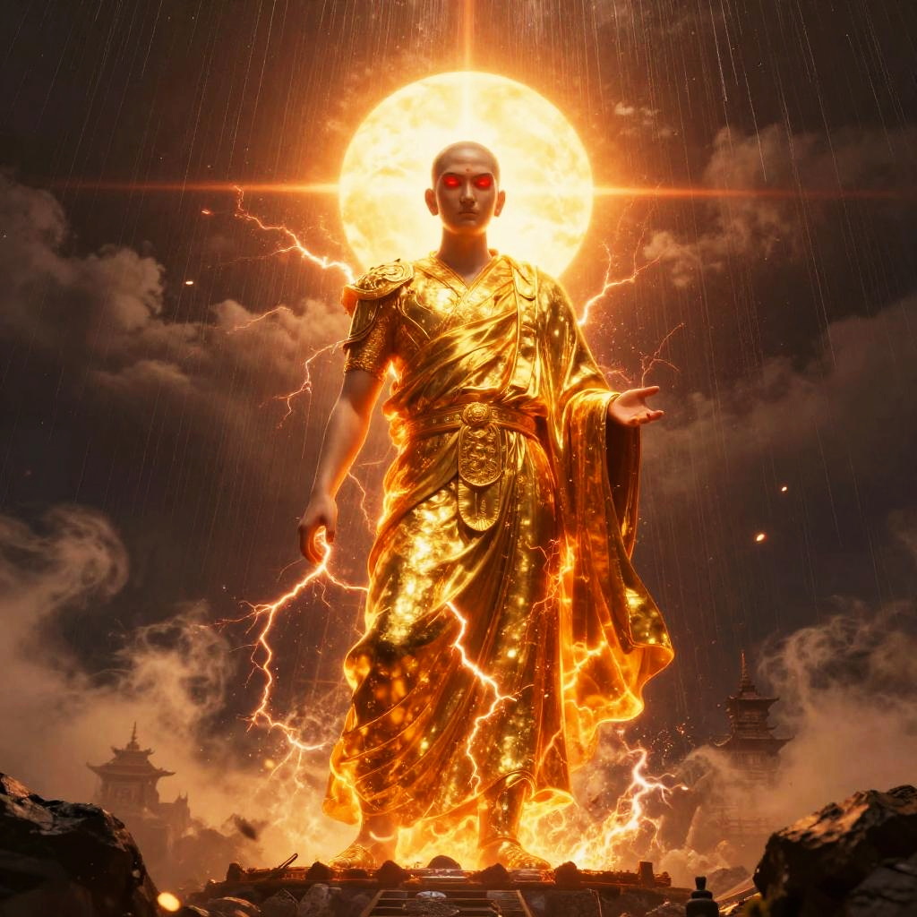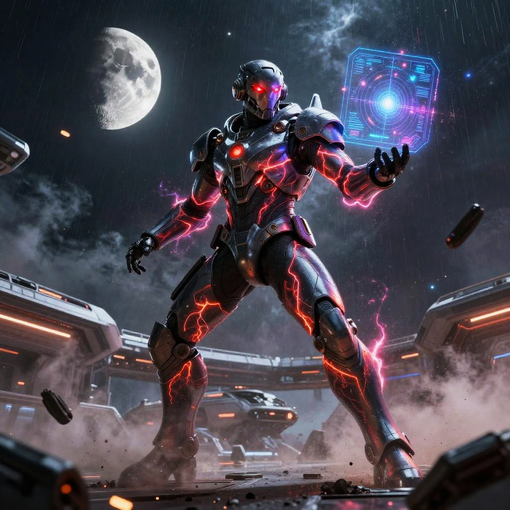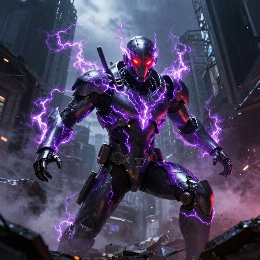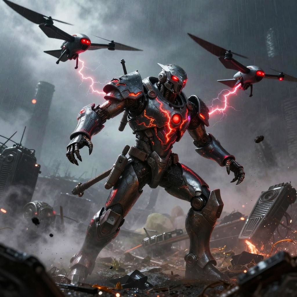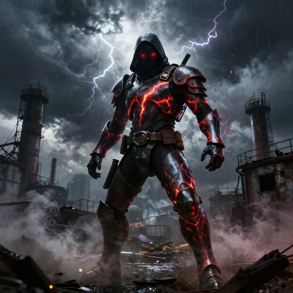Giant ice elemental towering with crystalline shards piercing the air in raging blizzard atop a frozen mountain peak, red eyes blazing, dark metallic armor contrasting vivid swirling fire; lightning veins a stormy sky, sparks and embers fly, rain or dust whipping, debris and smoke swirl. Dynamic low-angle pose, high contrast, dramatic rim lighting, volumetric haze, saturated color, ultra-detailed textures, cinematic scale; comic-book realism finish; mood: fierce, cold, stark whites and icy blues, harsh lighting.
