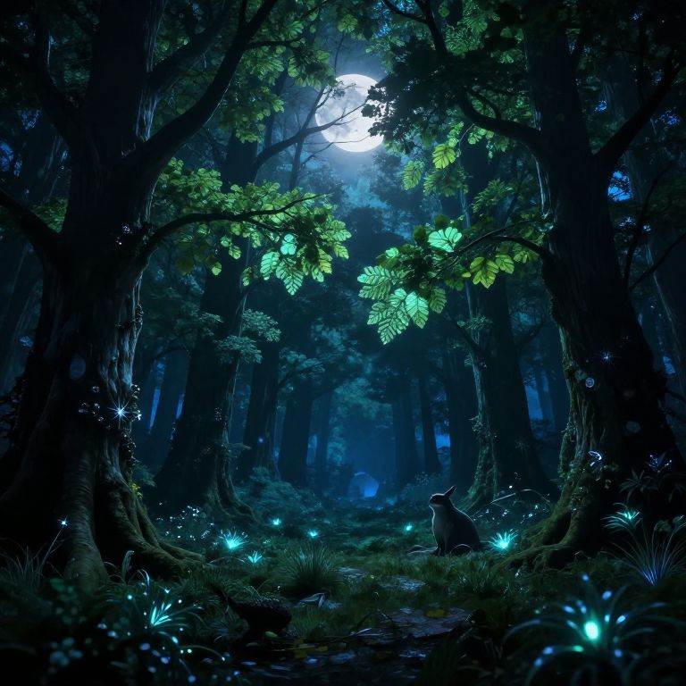 Digital artwork of a mystical forest at night, illuminated by a glowing moon, bioluminescent plants, and a small, shadowy figure among towering