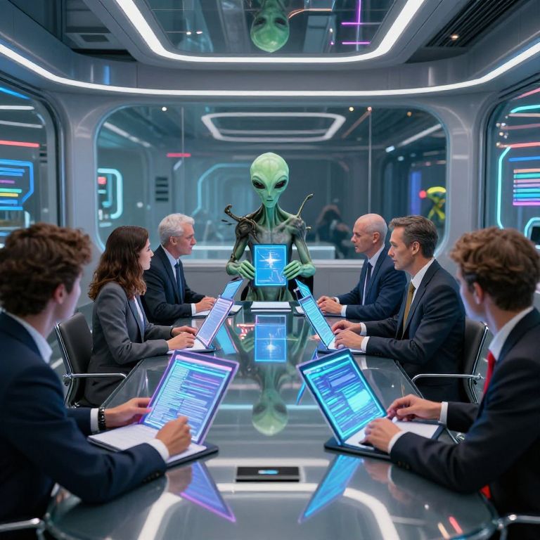 Science fiction meeting: Green alien with glowing eyes stands between six businesspeople in suits, all using illuminated laptops in futuristic, neon-lit room.