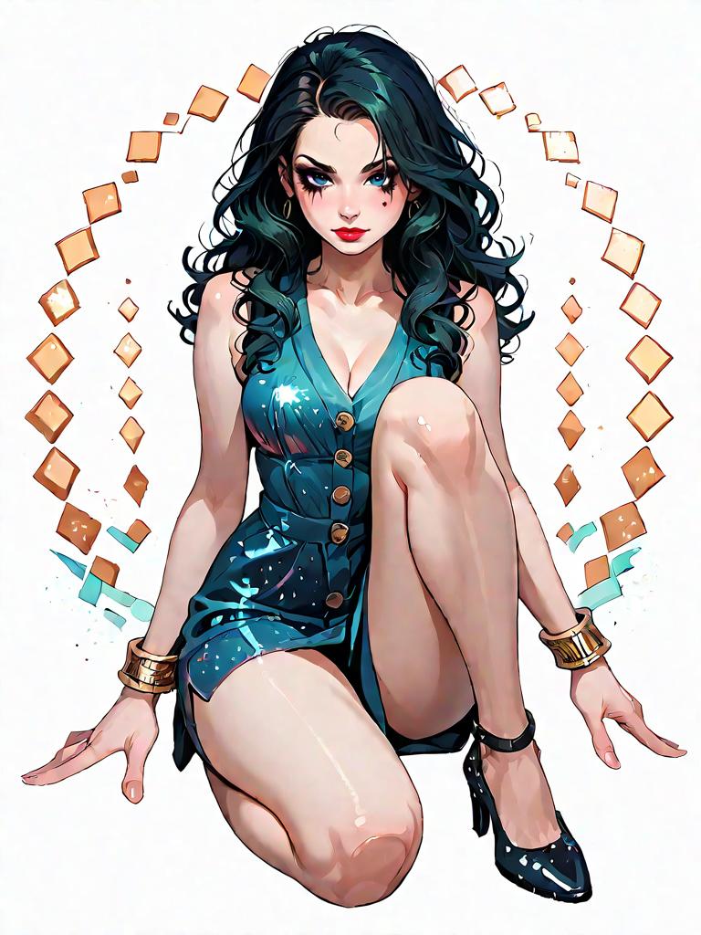 Illustration of a young woman with fair skin and green eyes, wearing a sleeveless emerald green shift dress with a scoop neck and large front patch pockets. She is seated, showcasing her black lace-up combat boots with chunky soles. Her dark teal hair is styled in a side braid with a hairpin accessory. The background is plain white, highlighting the minimalist and stylish look.