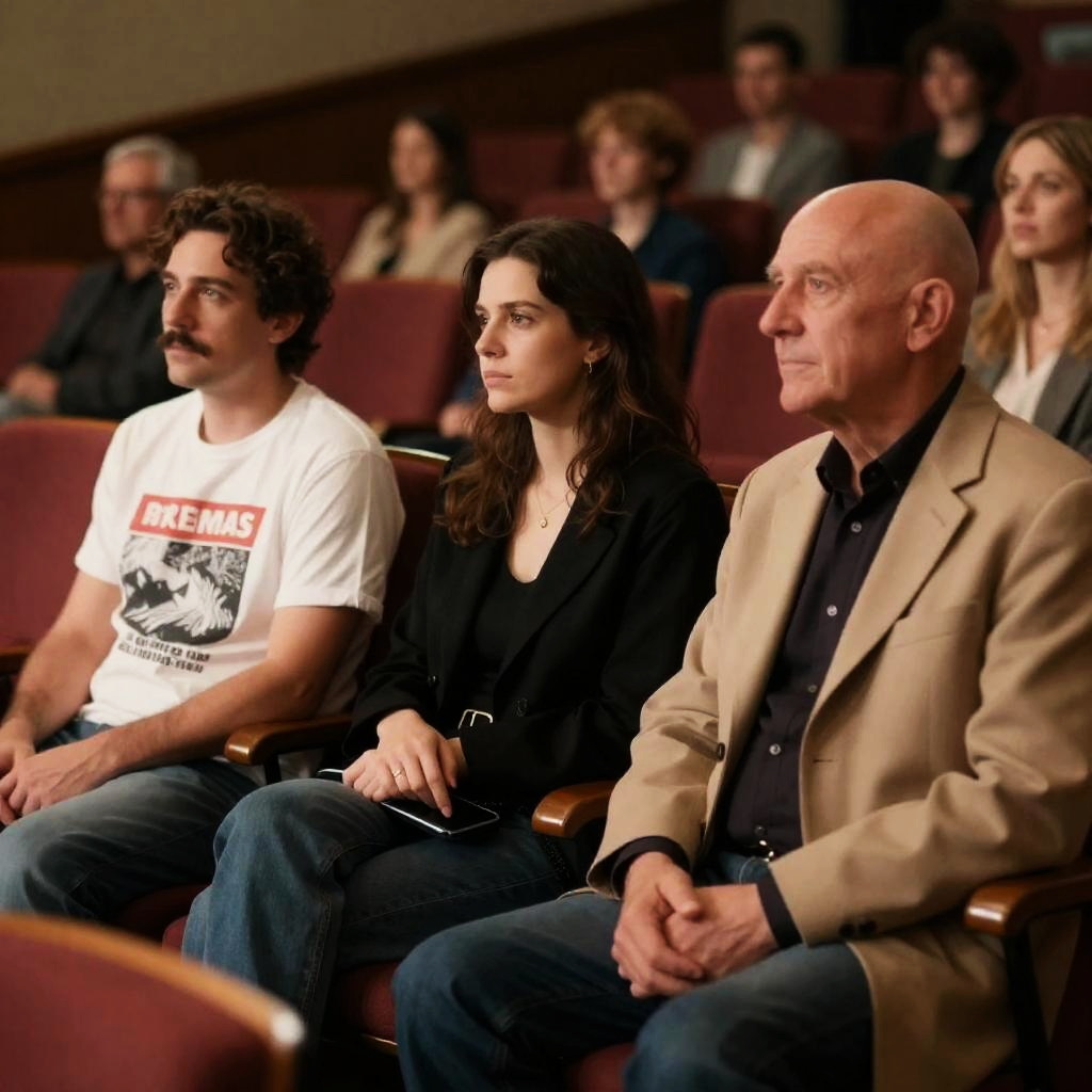 Photograph of three people sitting in a theater. A man with a mustache and white graphic t-shirt, a woman with brown hair and a black jacket, and an older man with a bald head and beige coat. The woman looks to the right, the man on the left looks at the mustached man. Background includes other seated people and theater seats.