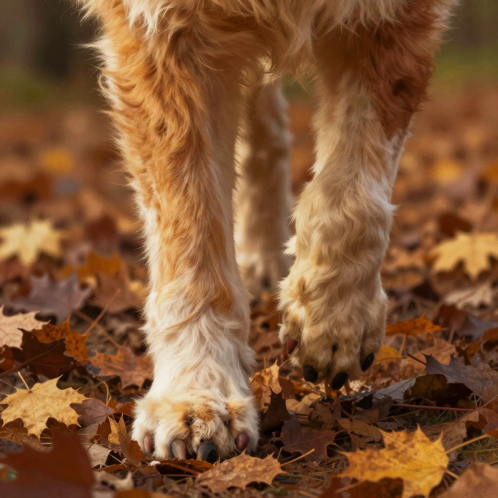 Furries feet walking through autumn leaves, textured fur, detailed paw pads, warm tones, dynamic shadows, forest background, high resolution digital painting