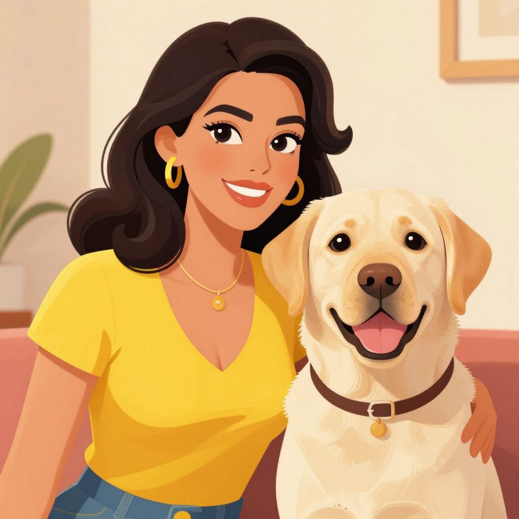 Digital illustration of a smiling woman with medium brown, wavy hair and large hoop earrings, wearing a yellow V-neck shirt and a gold necklace with a small pendant. She stands beside a happy white Labrador Retriever with a pink tongue hanging out. The woman's right arm is around the dog's neck. The background is a simple, gradient white to light yellow, emphasizing the subjects. The illustration style is vibrant and cartoon-like with bold colors and smooth, clean lines.