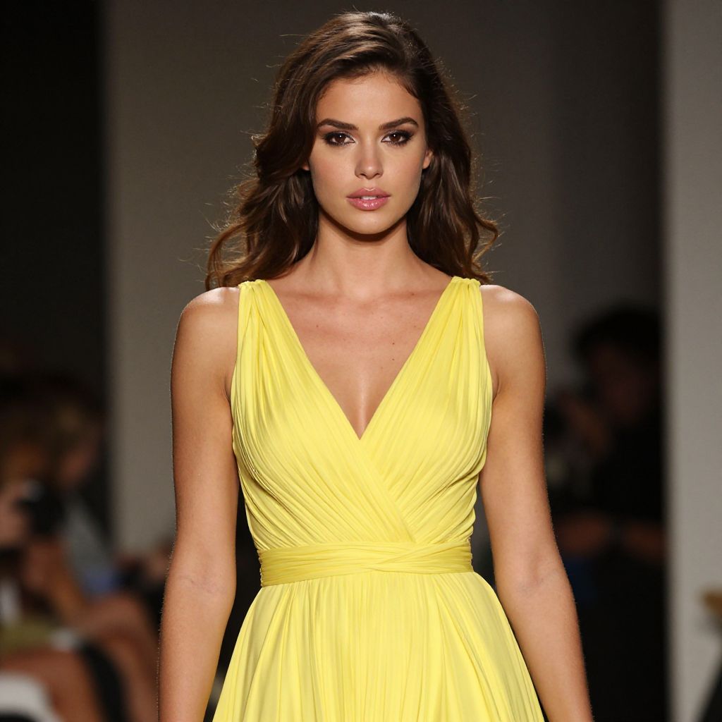 Photograph of a brunette model with wavy hair, wearing a sleeveless, deep V-neck, bright yellow dress, walking down a fashion runway.
