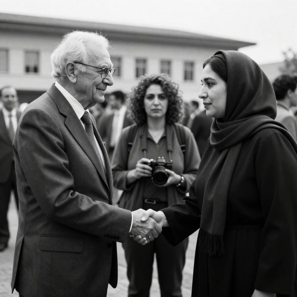 Black-and-white photograph. Three people. Elderly man in suit, glasses, and tie, shaking hands with woman in dark dress and headscarf. Woman with curly hair, holding camera, standing between them. Background: large building, people standing. Man smiling, woman serious.