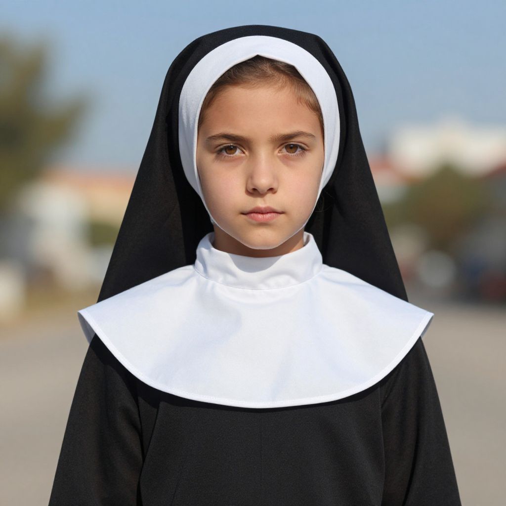 Photograph of a young girl with light brown skin, brown eyes, and brown hair, wearing a traditional black and white nun's habit, standing outdoors