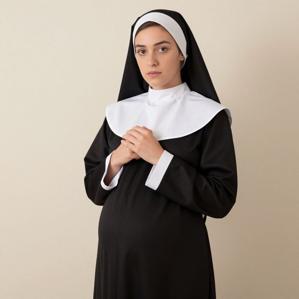 "nun kid costume, solo, 1girl, outdoors, nun, blurry background, blurry, looking at viewer, habit, brown hair, traditional nun, day, realistic, brown eyes, long sleeves, blue sky, closed mouth Realistic photo of casual sexy person with pretty face"
