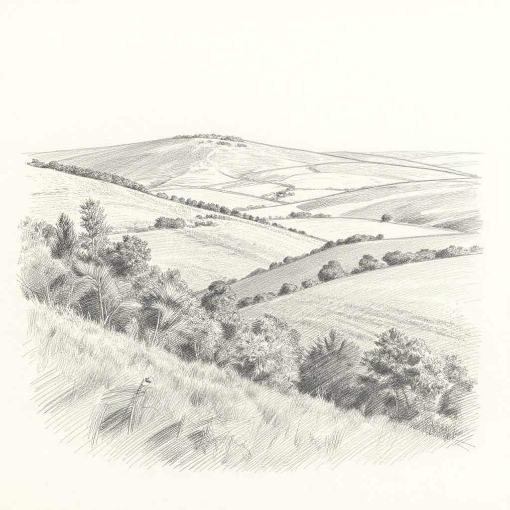 This is a black-and-white pencil sketch of a rolling countryside landscape. The foreground features dense, textured bushes and grass, while the mid-ground showcases gently sloping hills with scattered trees. The background consists of more undulating hills, with lighter shading indicating distance. The sketch uses fine lines to create depth and texture, emphasizing the natural contours and patterns of the terrain. The overall style is realistic with a focus on detailed, cross-hatched shading. The white background contrasts with the detailed black pencil work, highlighting the landscape's natural beauty.