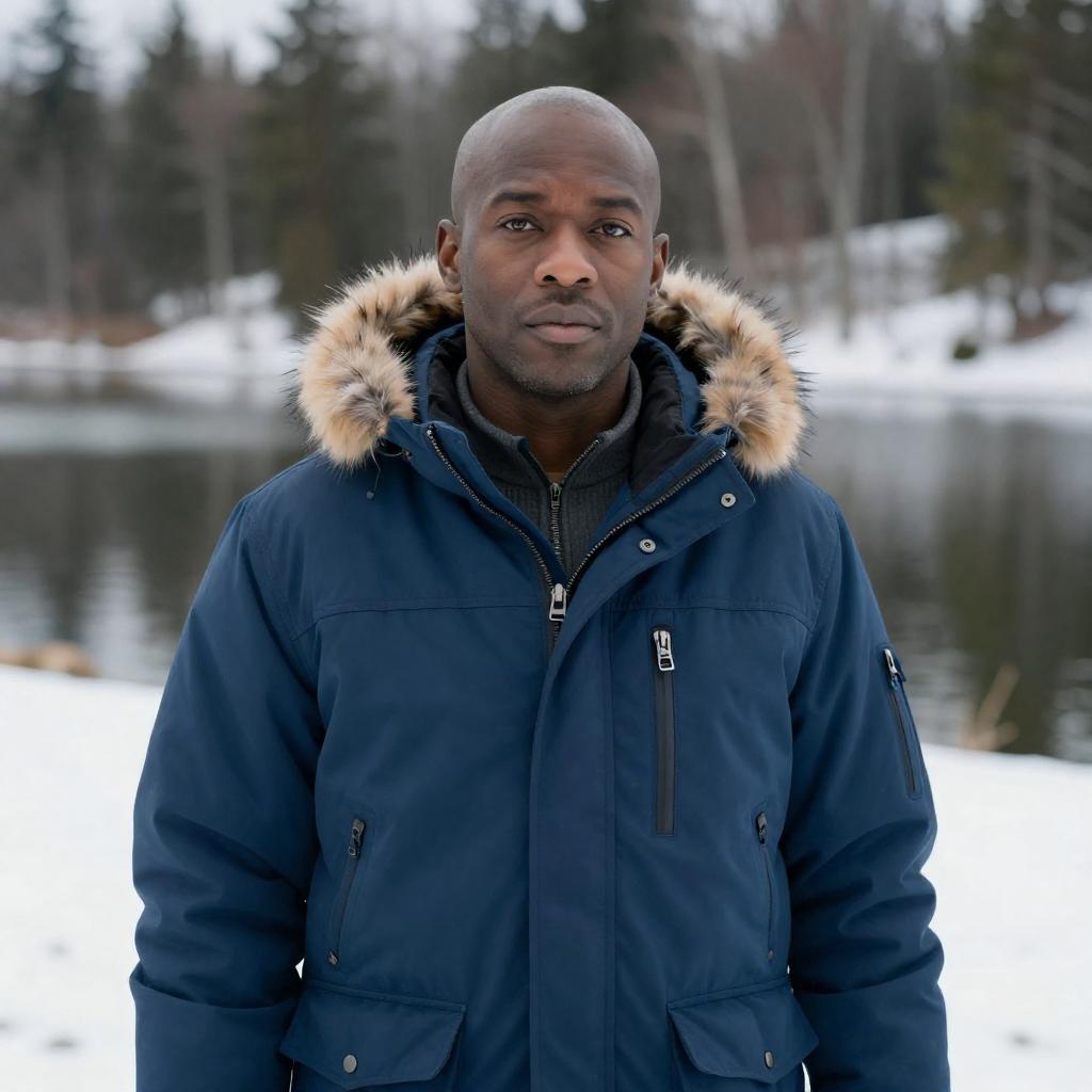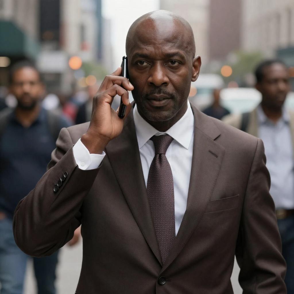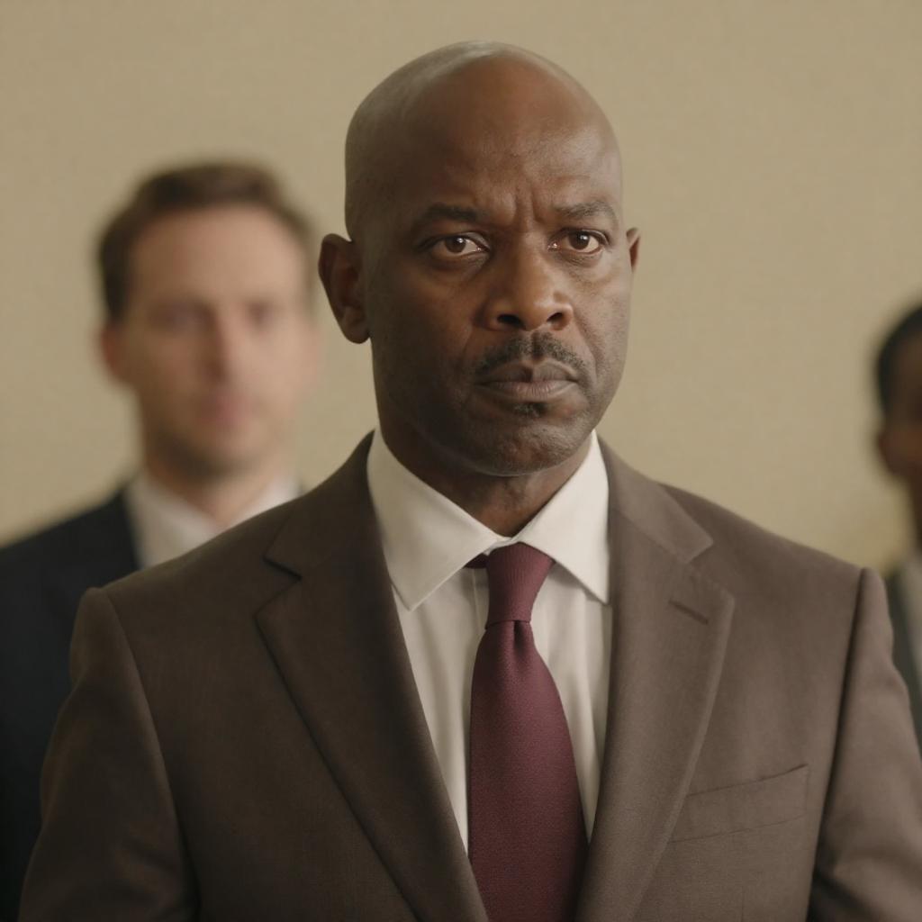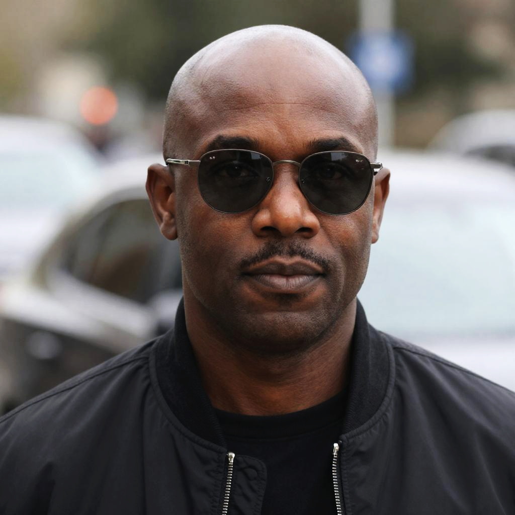 Photograph of a bald, middle-aged Black man with a serious expression, wearing a black suit, white shirt, and striped tie. He stands against a blurred urban background with a white wall on the left. His skin is smooth and he has a small earring in his left ear.