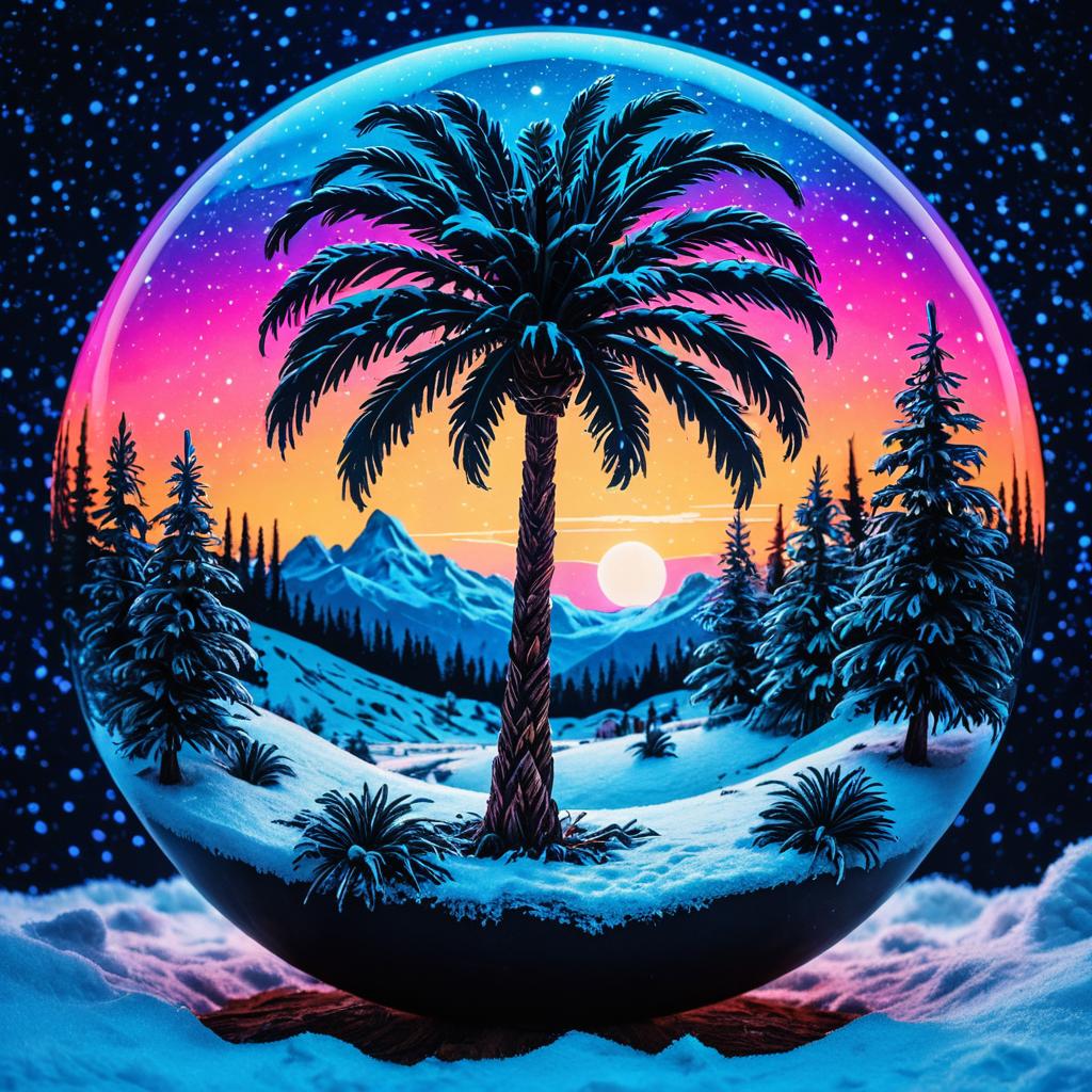 A surreal and luminous palm tree enclosed within a glowing, orb-shaped sphere featuring a miniature snowy landscape at twilight and sunrise. The scene combines vibrant neon colors and cosmic blues with a starry celestial background, showing detailed tree roots and snow-covered evergreen trees. Psychedelic digital brushwork and sharp light rendering enhance the otherworldly atmosphere.