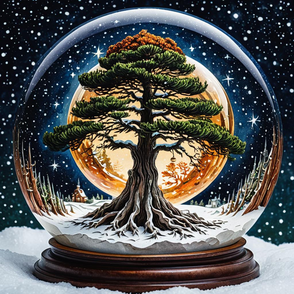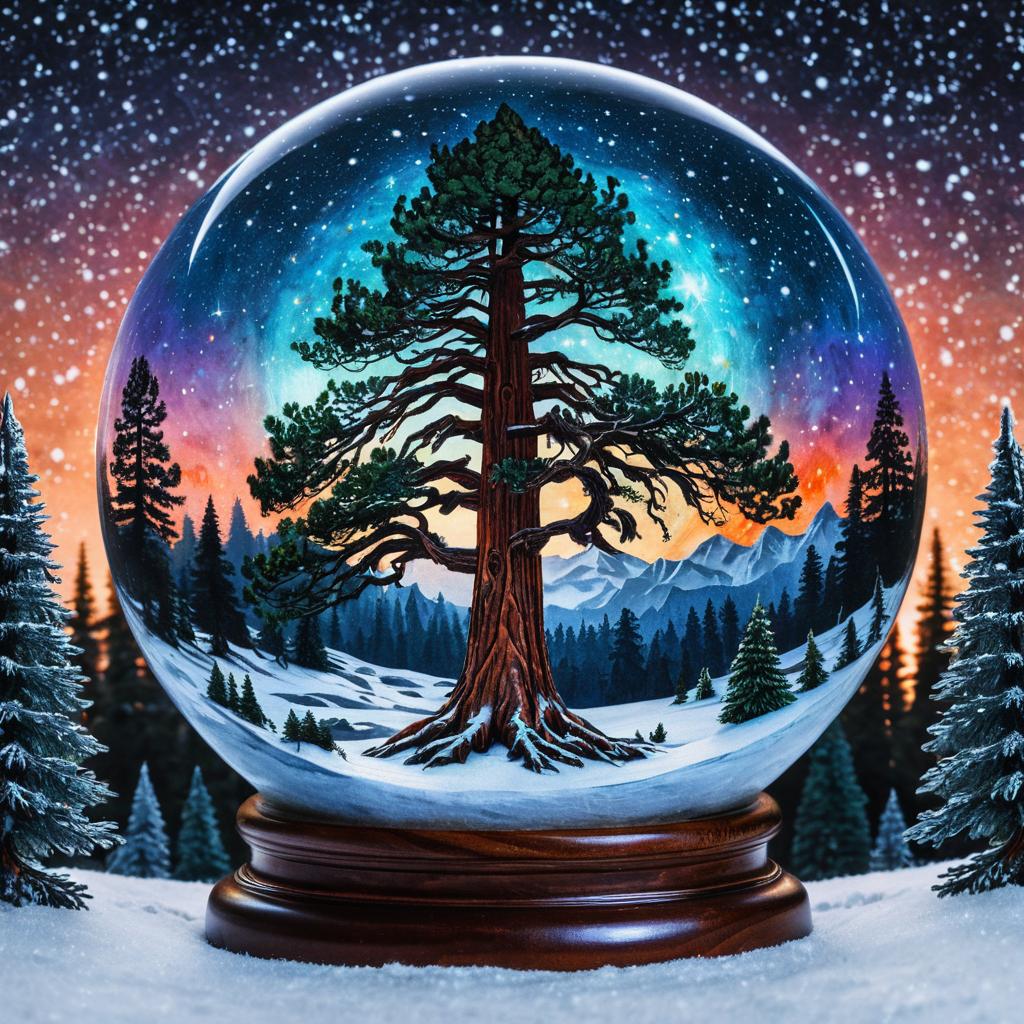 A otherworldly, luminous palm tree, suspended within a glowing, orb-like sphere, encompassing a miniature landscape of snowy Christmas twilight and sunrise, featuring detailed, intricate root systems, vibrant neon brights and cosmic blues, and a celestial, starry background, all rendered with psychedelic digital brushwork with sharp light rendering.