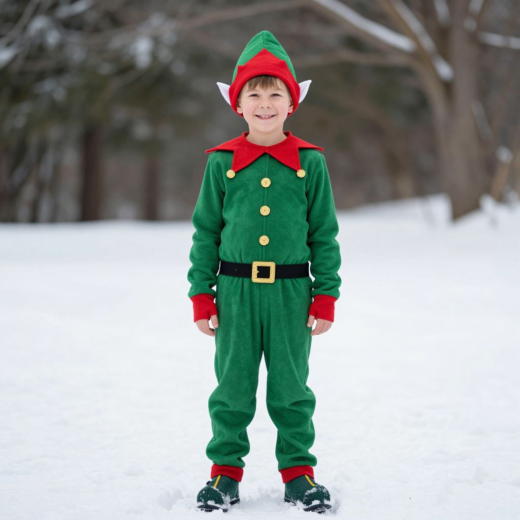 Buddy Elf Costume Boy, boy in green and red elf costume standing in snow