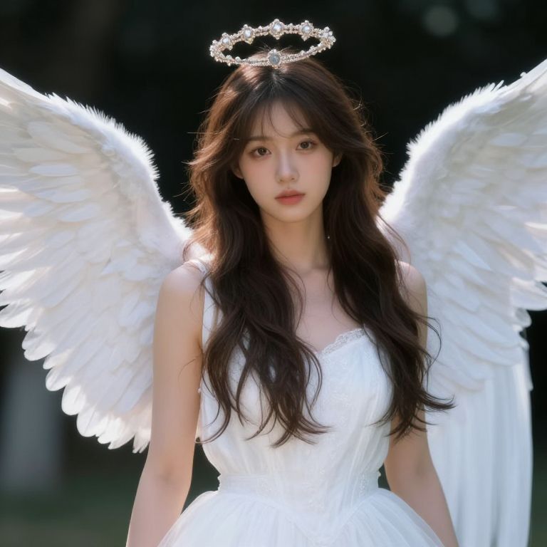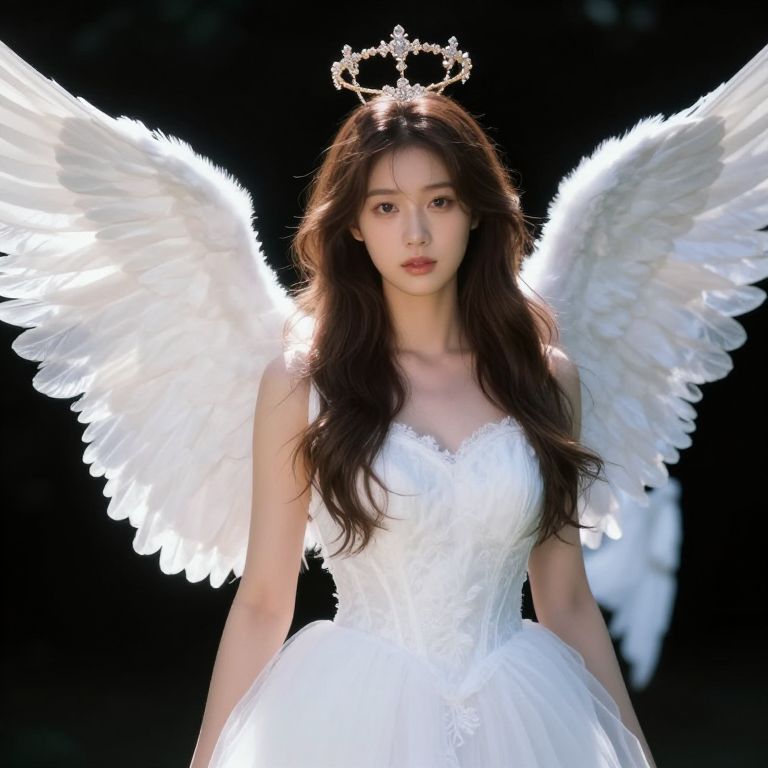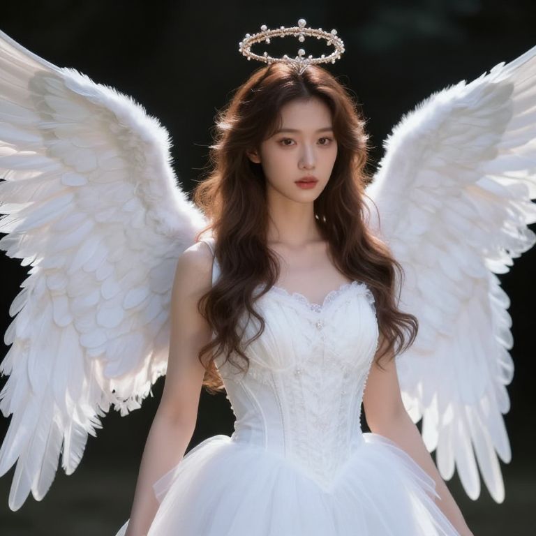 Photograph of an Asian woman with long brown hair, wearing a white angel dress, halo crown, and glowing white wings, standing in a dark,