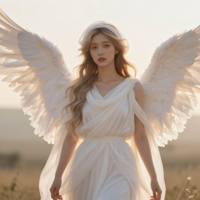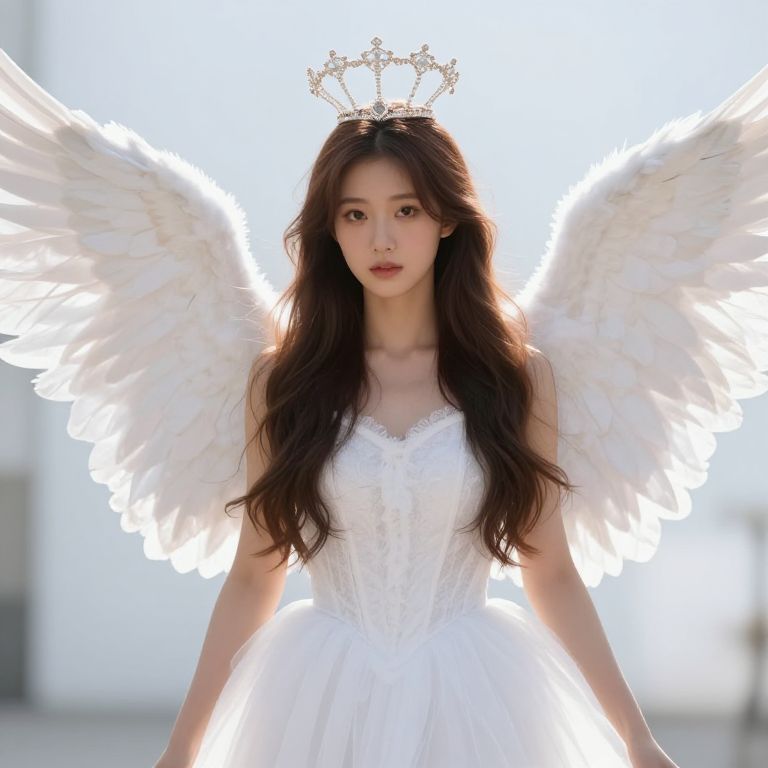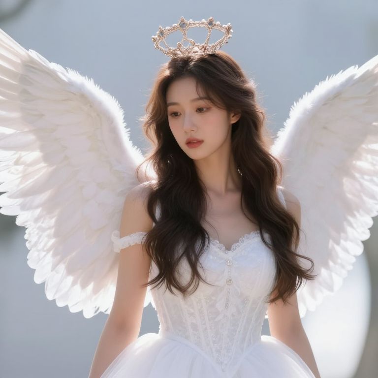Photograph of an Asian woman with long, wavy brown hair, wearing a white, sleeveless angelic dress and large, glowing white feathered wings. She has a silver, crown-like halo on her head and is holding the neckline of her dress with her right hand. Her expression is neutral with slightly parted lips. The background is blurred and dark, emphasizing her radiant, illuminated appearance. The image has a magical, ethereal quality, with a focus on her angelic costume and luminous wings.