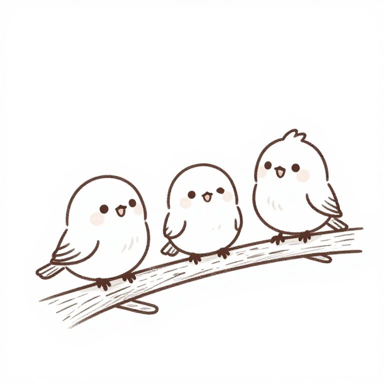 Black and white drawing of three cute, round, chibi-style birds with simple lines, sitting on a curved branch.