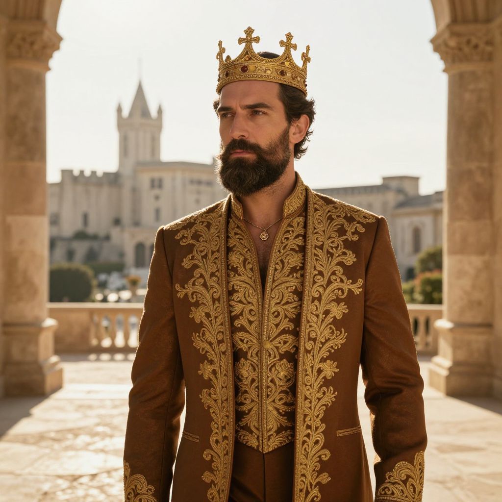 A distinguished man with a full, neatly groomed beard, wearing a royal crown that rests proudly on his head, dressed in a brown tailored suit with intricate gold-threaded embroidery that catches the sunlight, a subtle golden necklace glinting elegantly around his neck, standing confidently in a grand, sunlit courtyard surrounded by ancient stone pillars and a majestic distant castle rising in the background, the golden hour casting warm, soft light across the scene, exuding an aura of timeless authority, wisdom, and elegant regality.