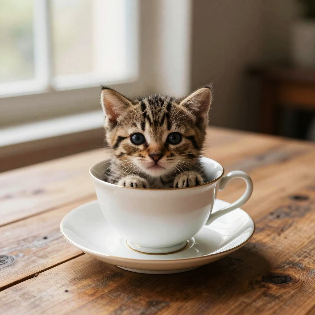 Tinytabby, an adorable miniature tabby resting inside a teacup on a rustic wooden table, soft natural light streaming through a nearby window, intricate fur details, cozy and warm indoor atmosphere evoking comfort