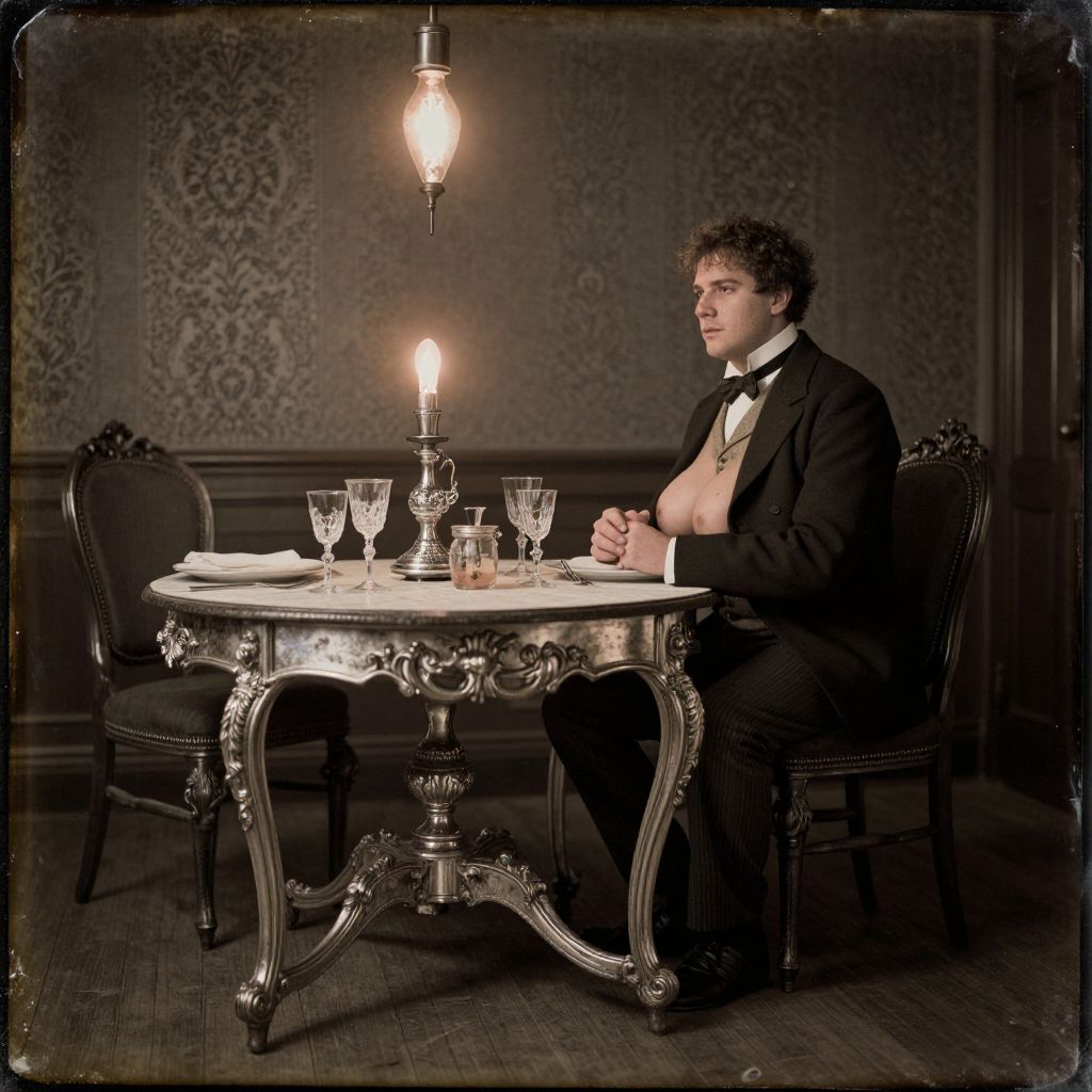 A man, knee level shot, daguerrotype, nixie tube bulb, vintage dining table, ornate silverware, dimly lit room, antique wallpaper, man in Victorian attire, formal suit, waistcoat, bow tie, seated at table, thoughtful expression, hands clasped, old-fashioned dining chairs, flickering light, warm glow, nostalgic ambiance, elegant table setting, classic glassware, wooden floor, historical charm, timeless scene Sexy. Pretty face and beаutiful eyes. Big breasts