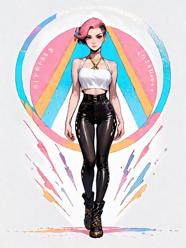 Illustration of a stylish woman with short pink and black hair, wearing a pale pink halter neck crop top with gold embellishments and black high-waisted faux leather leggings. She features a realistic face and a confident pose, standing against a colorful circular geometric background.