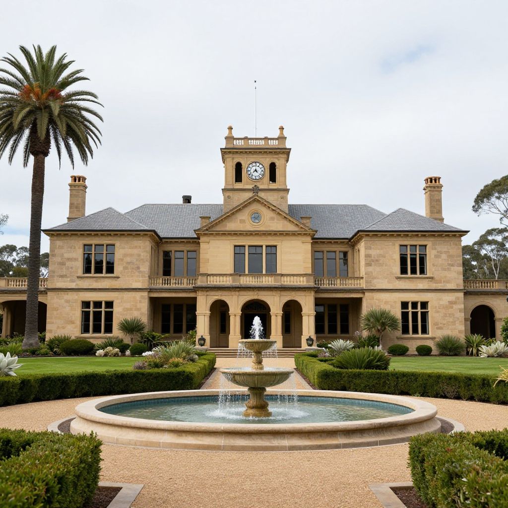 Elegant stone mansion with three chimneys and a central clock tower stands majestically behind a meticulously landscaped garden featuring a circular fountain, neatly trimmed hedges, and a tall palm tree, embodying the grandeur of Cameron Lodge in Mt Macedon, Victoria.