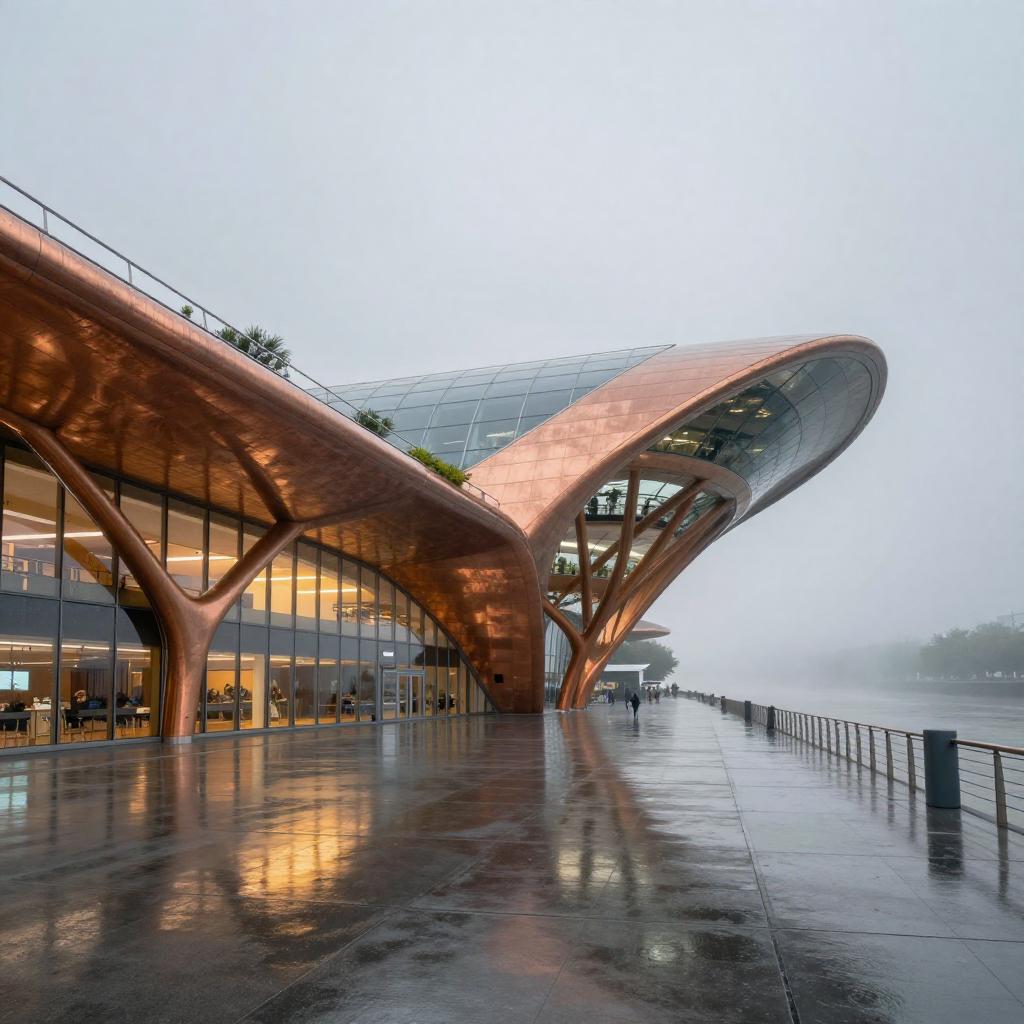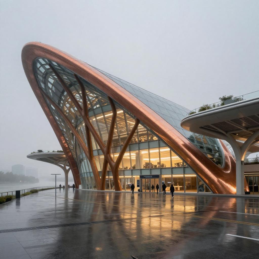 RAW photo, futuristic riverside intermodal transit hub exterior with sweeping canopies and integrated green terraces, frontal elevation, biomorphic shell of polished copper and reflective glass with sinuous timber ribs and parametric latticework, inspired by Calatrava, dawn mist over the river, warm interior glow through glass, pale overcast sky, rain-slick plaza with soft cinematic highlights, open plaza foreground, architecture photography, hyper realistic, super detailed, 8k, Nikon Z9, 14mm ultra-wide, tripod, tilt-shift correction, long exposure, true verticals, clean lines, sharp reflections, calibrated white balance, subtle film grain, HDR bracketed, crisp edges, minimal signage