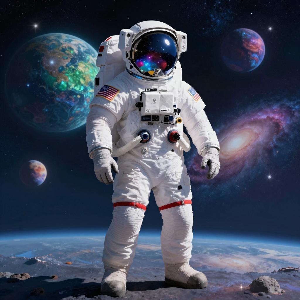 Digital illustration of an astronaut standing on a planet's surface with a colorful galaxy backdrop. The astronaut is equipped with a detailed space suit featuring an American flag patch, helmet reflecting cosmic hues, and background planets and stars in vibrant blues, purples, and greens.