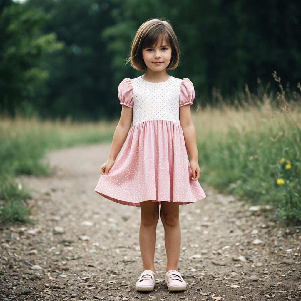 Photograph of a young girl standing on a dirt path in a sunny meadow. She has long, light brown hair braided into two pigtails, with a serious expression on her face. She is wearing a colorful, bohemian-style dress with a patterned bodice and floral print skirt, featuring pink, orange, and green colors. The dress has short sleeves with intricate designs. The background is slightly blurred, showing tall green grass and wildflowers on both sides of the path, with a forest in the distance. Soft, natural sunlight illuminates the scene, creating a warm, golden glow. Realistic, candid style, high detail, slight bokeh effect. Ideal for promoting a natural, rustic, and innocent aesthetic. Tags: young girl, bohemian dress, braided hair, serious expression, dirt path, meadow, wildflowers, sunlight, natural light, realistic, high detail, background blur.