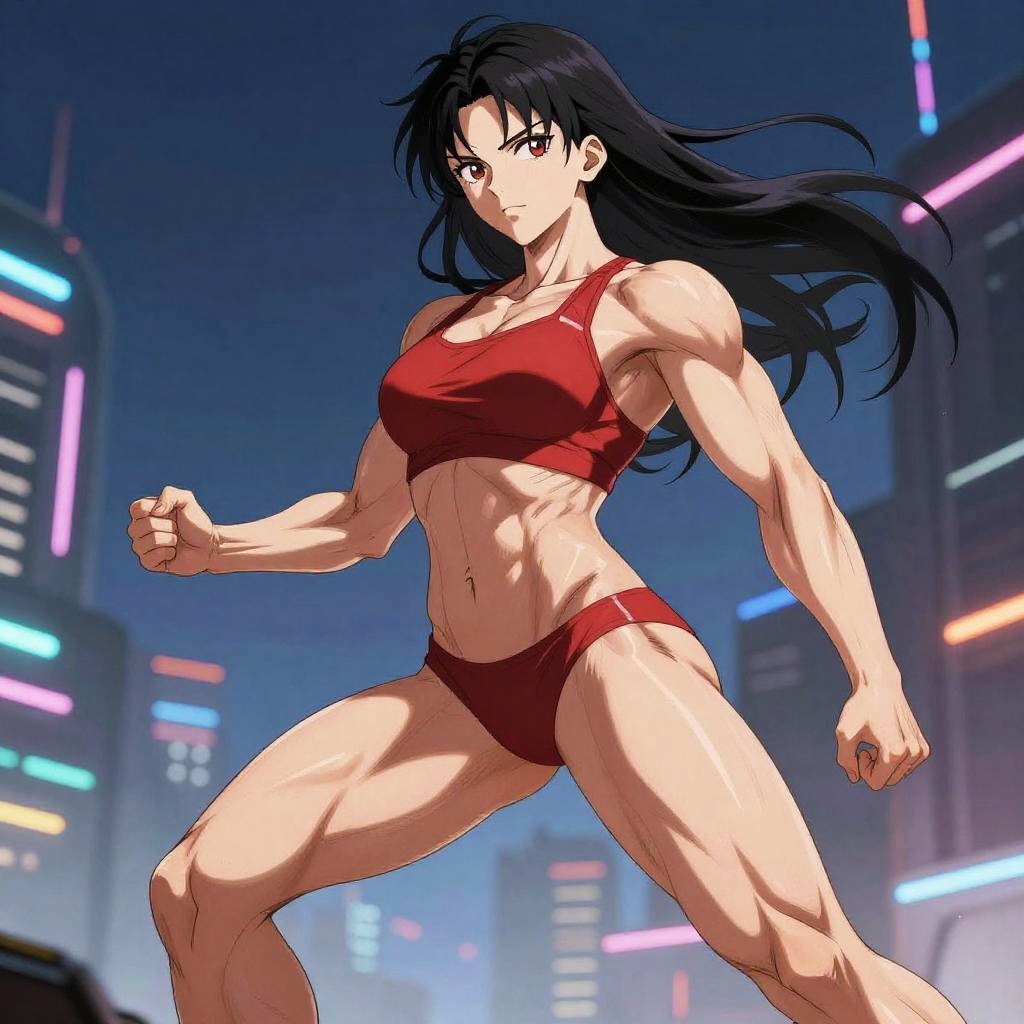 Anime muscle woman, dynamic pose, detailed muscular anatomy, vibrant colors, high contrast lighting, futuristic city background, anime style