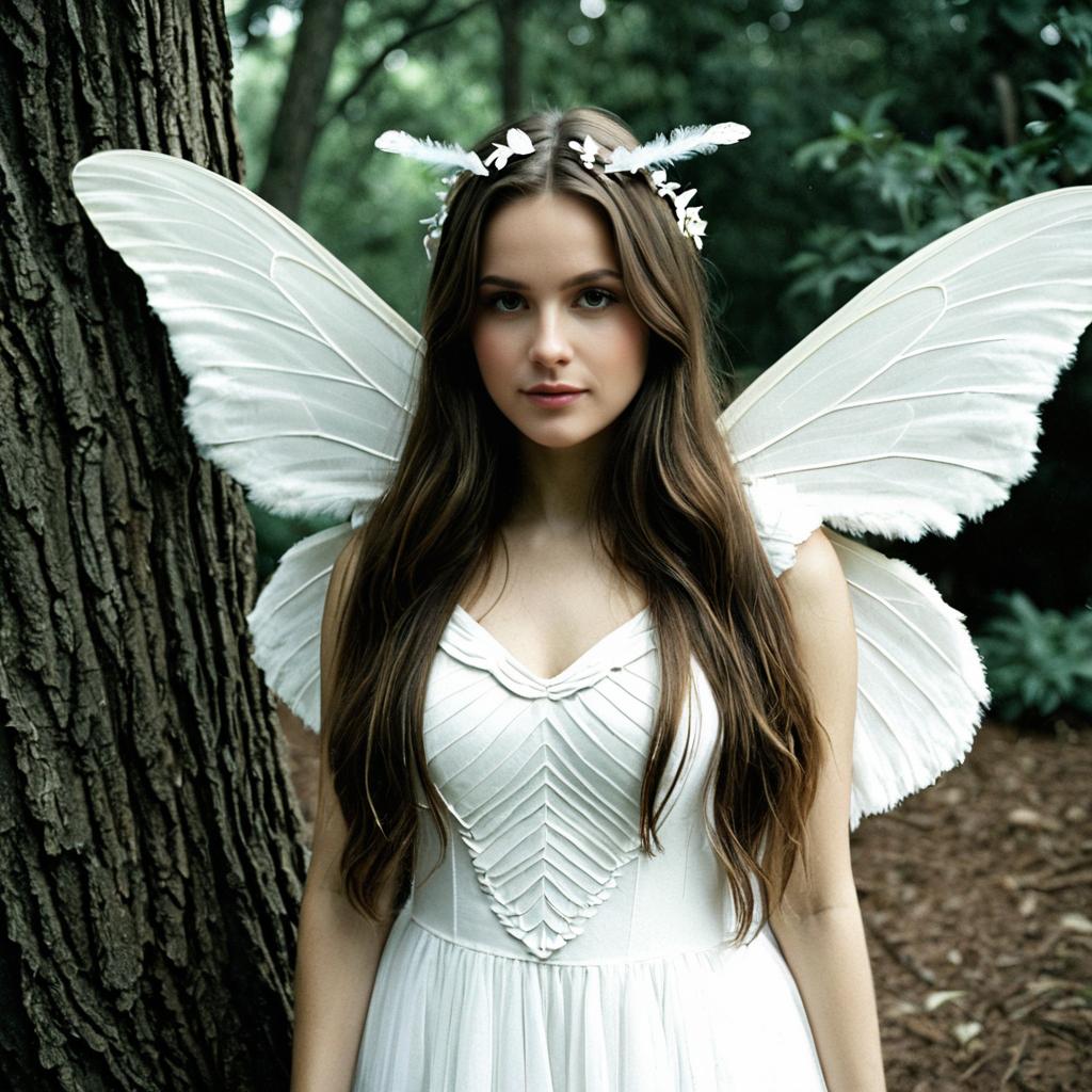 A young woman dressed in a white angel costume featuring a short dress with silver embroidery and fur trim, white thigh-high stockings with intricate patterns, large white feathered wings, and a sparkling halo. She stands confidently with hands on hips in a forest setting with tall trees and fallen leaves on the ground. The woman has long brown hair and a neutral expression.