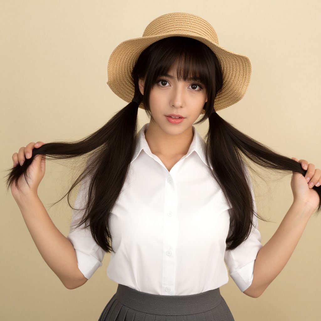 Photograph of an East Asian woman with long black hair in pigtails, wearing a white button-up shirt, gray skirt, and a straw hat. She holds her pigtails with both hands, her large brown eyes looking directly at the camera. Her fair skin contrasts with the light beige background. The image has a soft, slightly overexposed effect, giving it a gentle, almost dreamy quality. Her expression is neutral, with slightly parted lips. The focus is sharp on her face and upper body, with the background blurred.