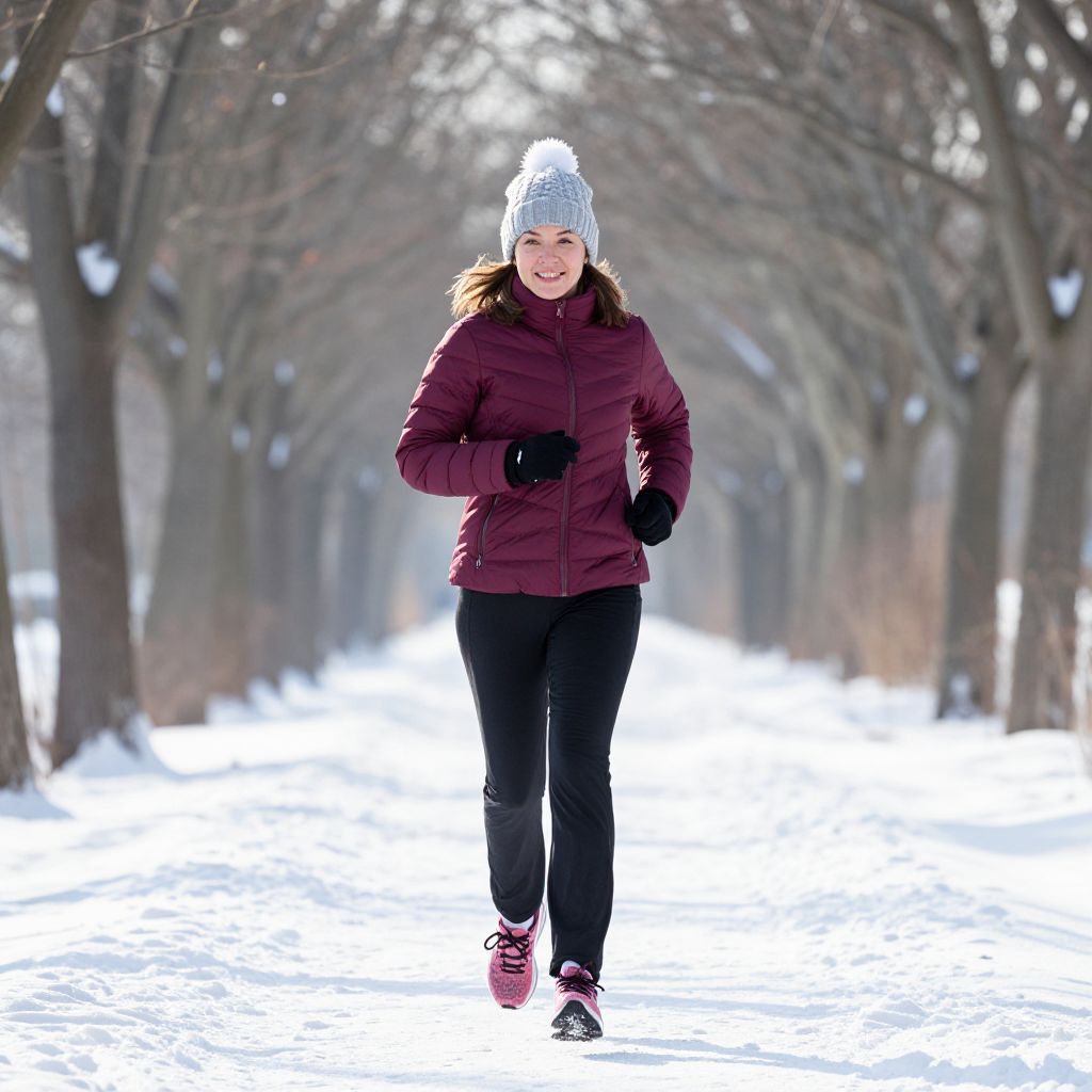 Photograph of a smiling woman jogging through a snowy, tree-lined path. She's wearing a gray knit beanie with a white pom-pom, a burgundy puffer jacket, black pants, and pink running shoes with black laces. Her black gloves and the bright sunlight filtering through the bare trees create a contrasting winter scene. The snow covers the ground, adding a crisp, white texture.