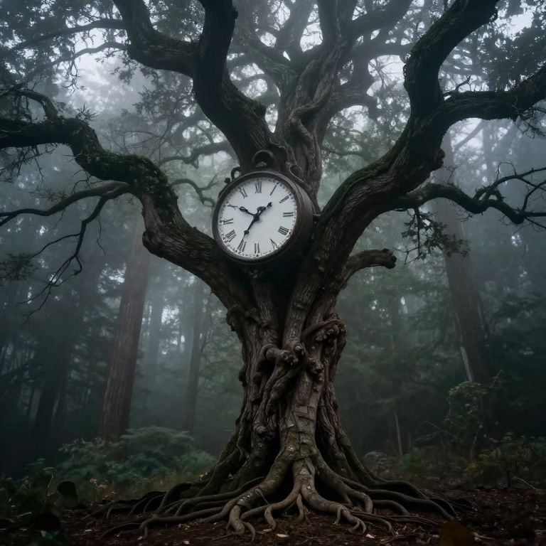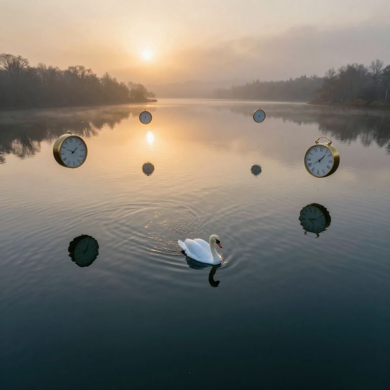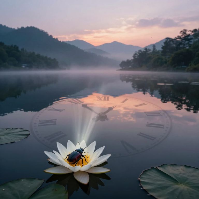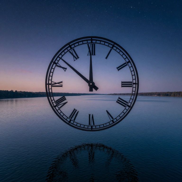 Photograph of a tranquil sunset scene featuring a clock floating in a still pond, surrounded by dark silhouettes of trees. The sky is ablaze with vibrant orange, pink, and purple hues. Ripples emanate from the clock, which is partially submerged, with its face and hands visible, showing the time as approximately 6:10. The reflection of the colorful sky is mirrored on the water's surface, enhancing the scene's serene beauty. The image conveys a peaceful, almost surreal atmosphere with contrasting dark and vivid colors.