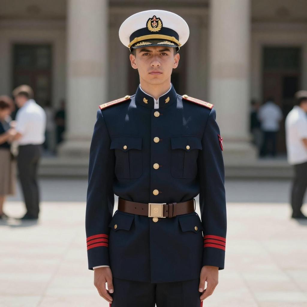 Photograph of a young, serious-looking male naval officer standing in a sunlit courtyard. He's wearing a dark blue uniform with red stripes on the sleeves, a brown belt, and a white naval cap with a gold emblem. His hands are relaxed at his sides. The background shows blurred architectural structures and people, creating a sense of depth. The image has a sharp focus on the officer, with a slightly muted, realistic color palette.