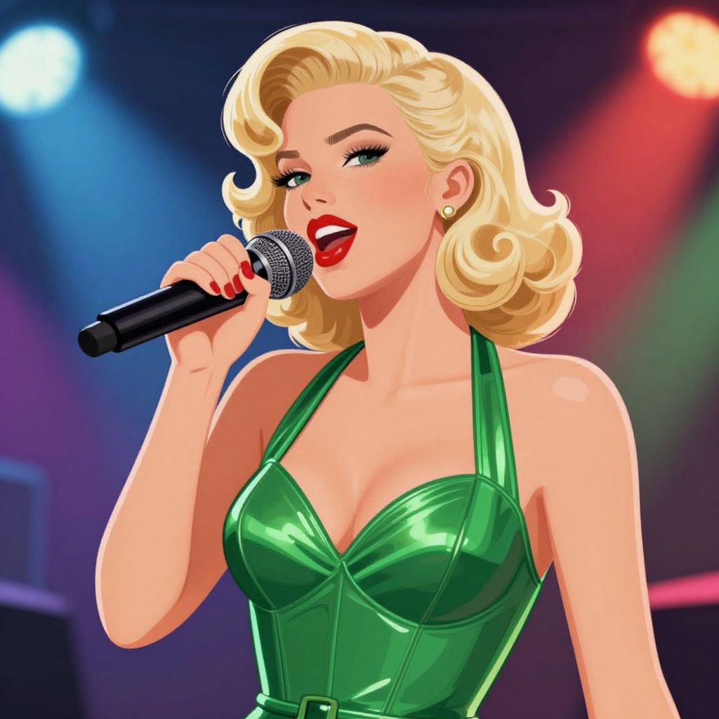 This is a vibrant, digital illustration of a blonde woman with vintage-style, curled hair, singing into a microphone. She's wearing a shiny, green, low-cut dress that highlights her cleavage. Her red lipstick pops against her fair skin. The background is blurred with colorful stage lights, adding a lively, concert-like atmosphere. She looks confident and enthusiastic, with a slight smile on her face.