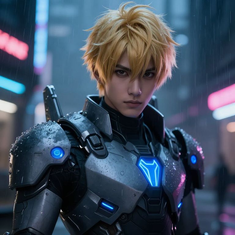 Anime guy with blonde hair wearing futuristic armor, glowing blue accents, intense gaze, urban sci-fi setting with neon lights, rain falling, moody atmosphere, high detail, digital art style