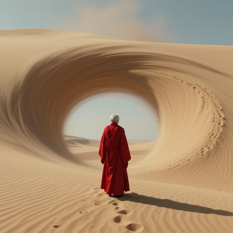 An elderly figure in a vibrant red robe stands at the edge of a surreal, spiraling vortex carved into a sandy landscape, evoking a dreamlike, computer-generated scene where reality bends and time seems to flow backward, reminiscent of a science fiction narrative exploring themes of entropy and reversed existence.