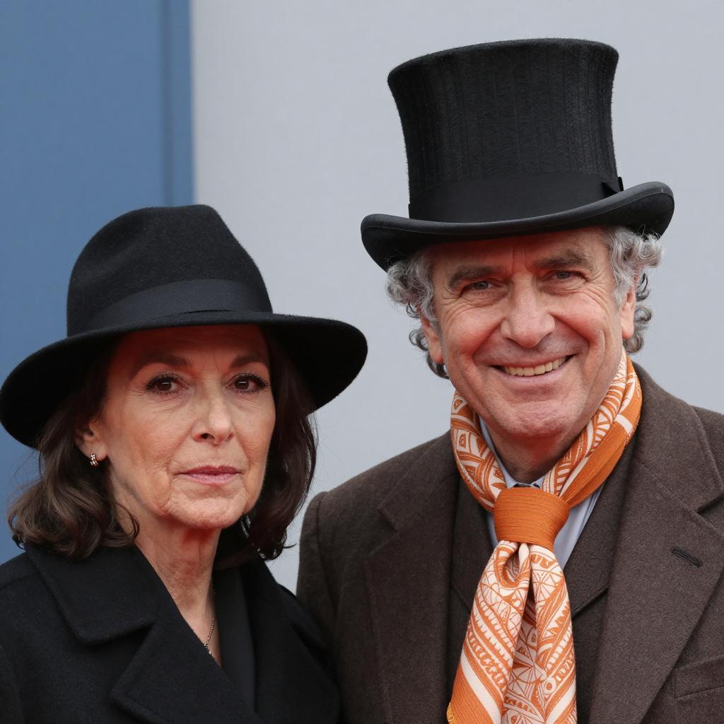 Photograph of a middle-aged couple smiling at each other. Woman with blonde hair, black top, orange strap, light blue glove. Man with gray hair, mustache, light gray jacket, black shirt, patterned tie. Both holding hands, standing in a crowd. Background includes partially visible people and red patterned garment.