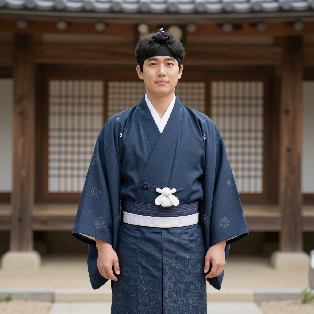 Photograph of a young Asian man standing in front of a traditional wooden Japanese building with shoji screens. He is wearing a dark navy blue kimono with white floral patterns, a white haori sash tied in a knot at his waist, and a black hairpin atop his short black hair. His expression is neutral, and he stands with his hands by his sides. The background features a tiled roof and wooden beams, adding to the traditional Japanese setting. The lighting is natural, highlighting the textures of the kimono fabric and the wooden structure behind him.