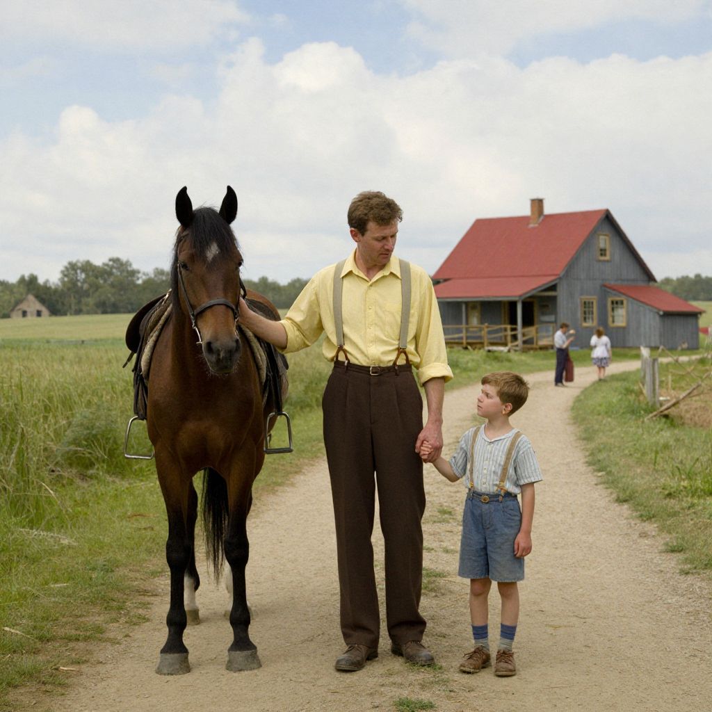 Photograph of a man and young boy standing on a dirt path in a rural setting. The man, with short brown hair, wears a yellow shirt, brown suspenders, and dark trousers. He holds the reins of a black horse on his left. The boy, with short brown hair, wears a striped shirt, denim overalls, and brown shoes. They are holding hands and looking at each other. In the background, a blue-gray house with a red roof is visible, along with a wooden fence and a few trees under a partly cloudy sky. Another person walks in the distance.