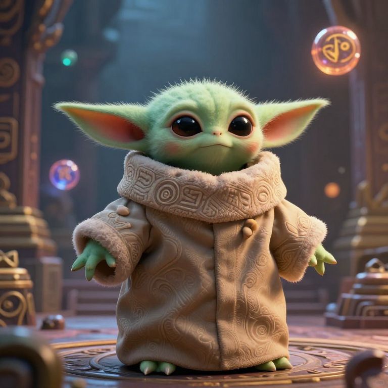 Grown Grogu in a mysterious ancient temple, surrounded by mystical symbols and floating orbs, intense gaze, detailed robes flowing with intricate patterns, soft ambient light casting dramatic shadows, fantasy art style with vibrant colors and high detail.
