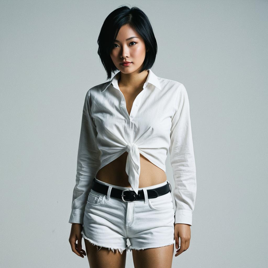 Portrait of an Asian woman with shoulder-length glossy black hair wearing a cropped black faux leather biker jacket over a white scoop-neck knit crop top. She also wears a high-waisted black pencil skirt featuring a bold red floral print and black lace hem. The model poses confidently against a soft gradient grey background with neutral lighting highlighting the leather texture.